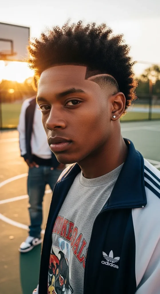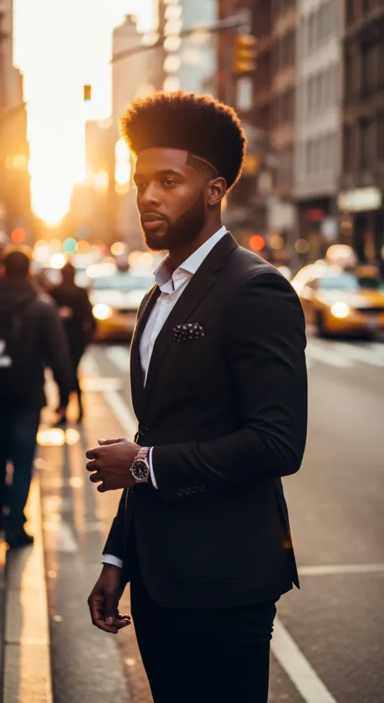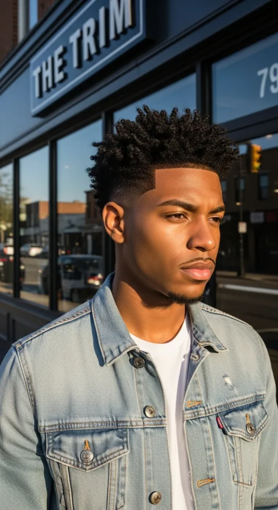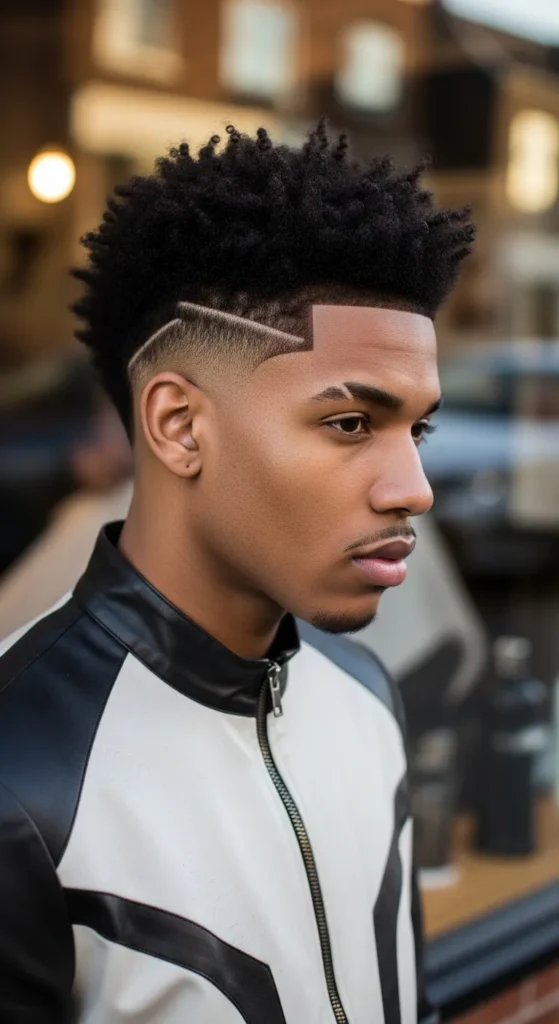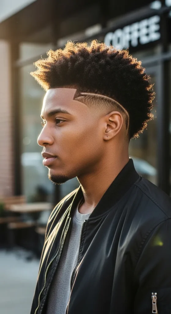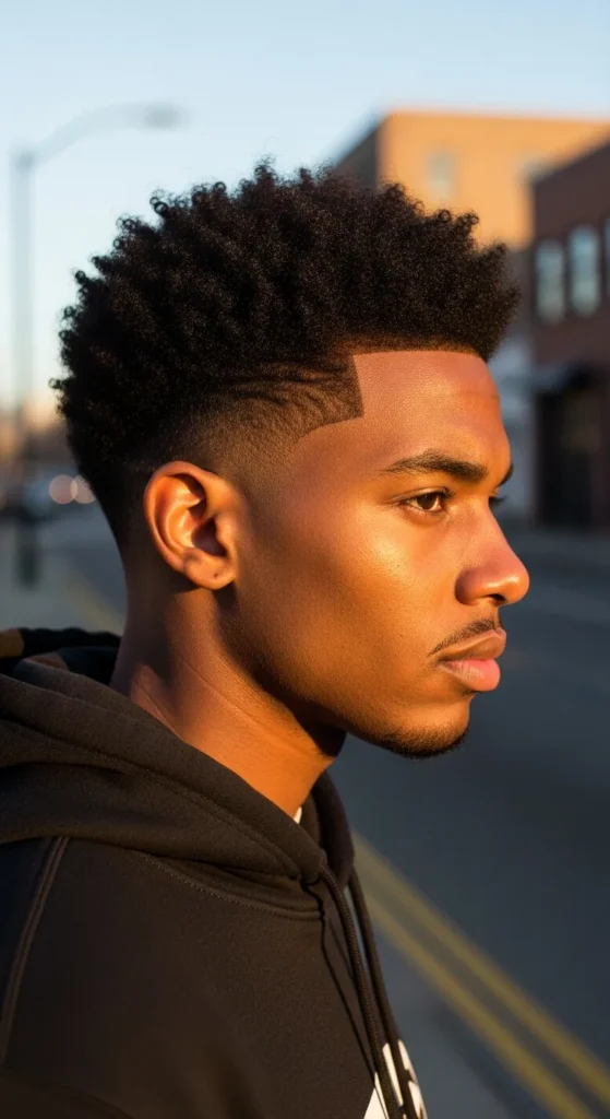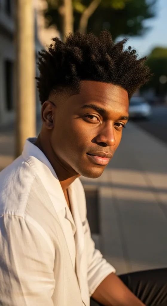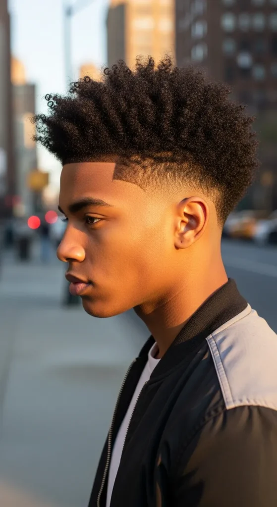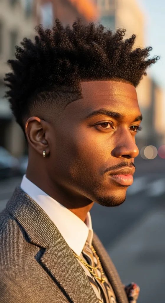 This bold style lifts the Afro higher on top while the sides fade sharply upward. The result is a tall silhouette that highlights natural curls and gives the haircut a powerful, statement-making presence.