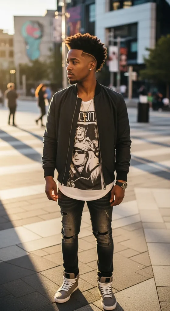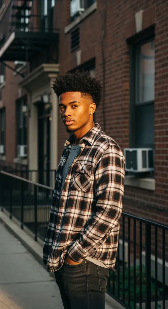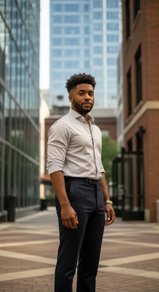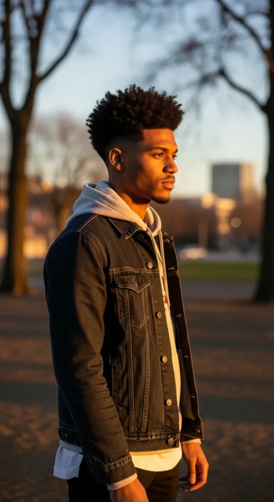 A low fade keeps the hairstyle balanced and natural while allowing the Afro texture to remain the star. It is subtle yet incredibly stylish for everyday wear.