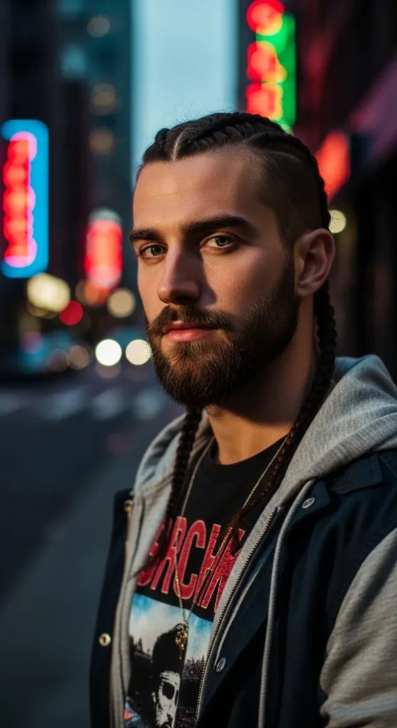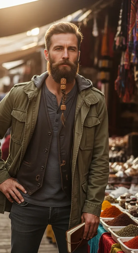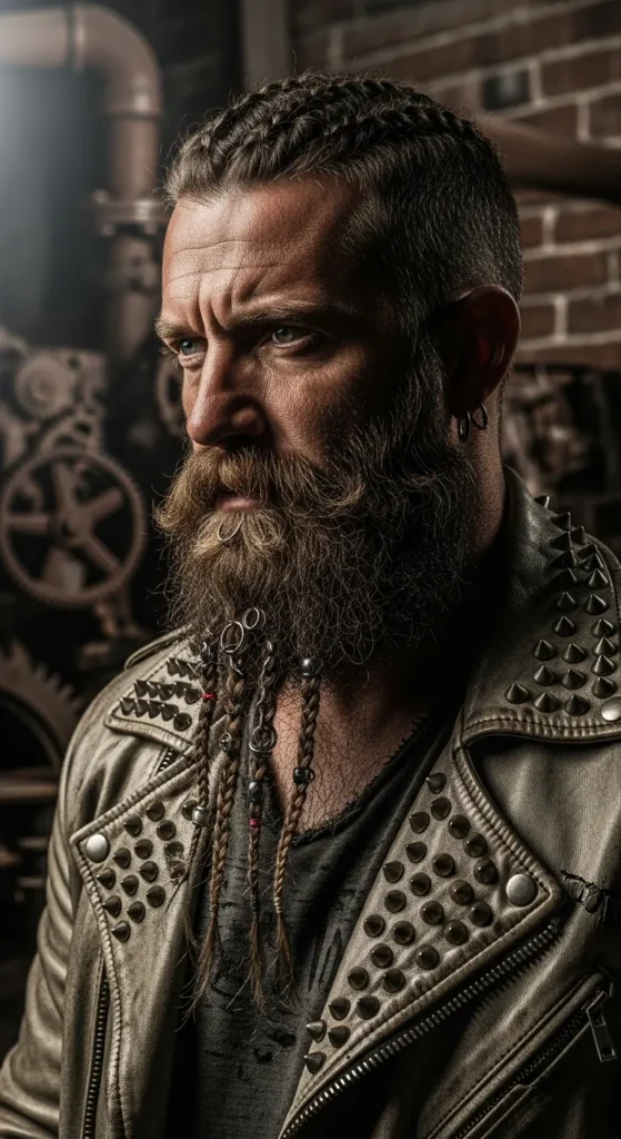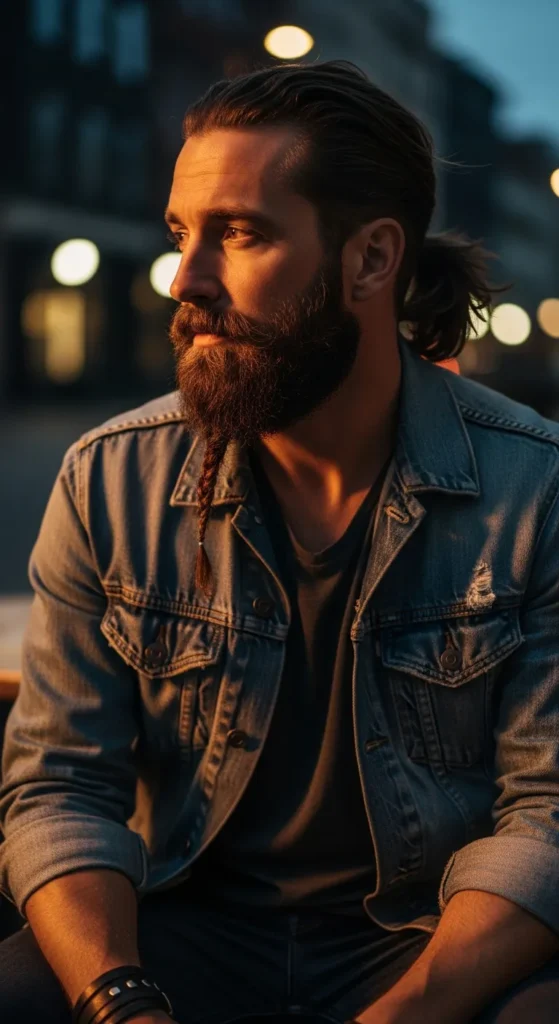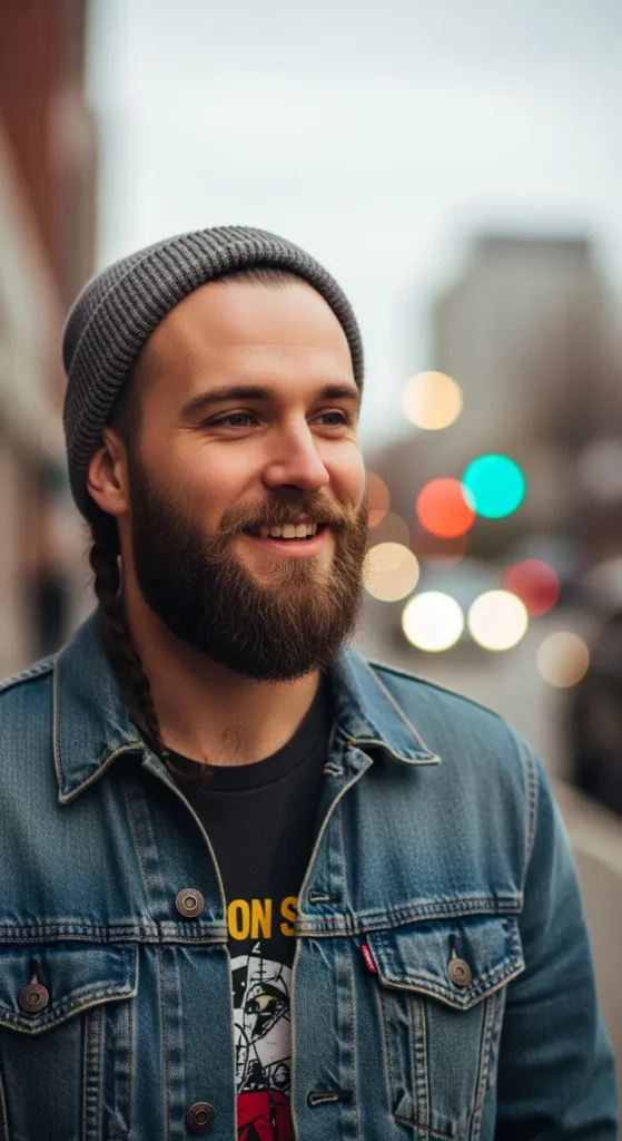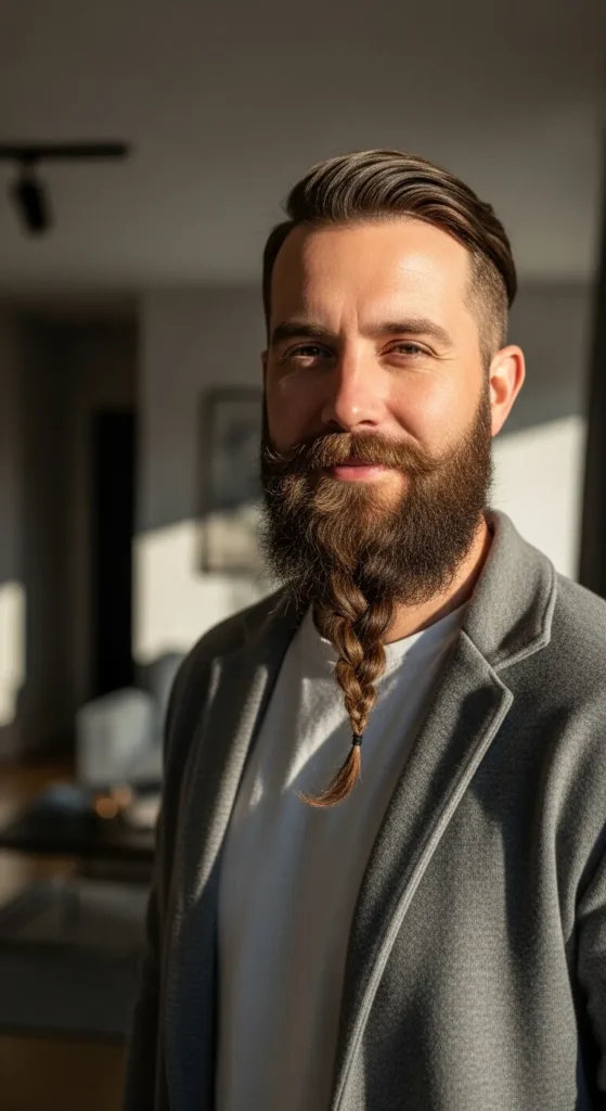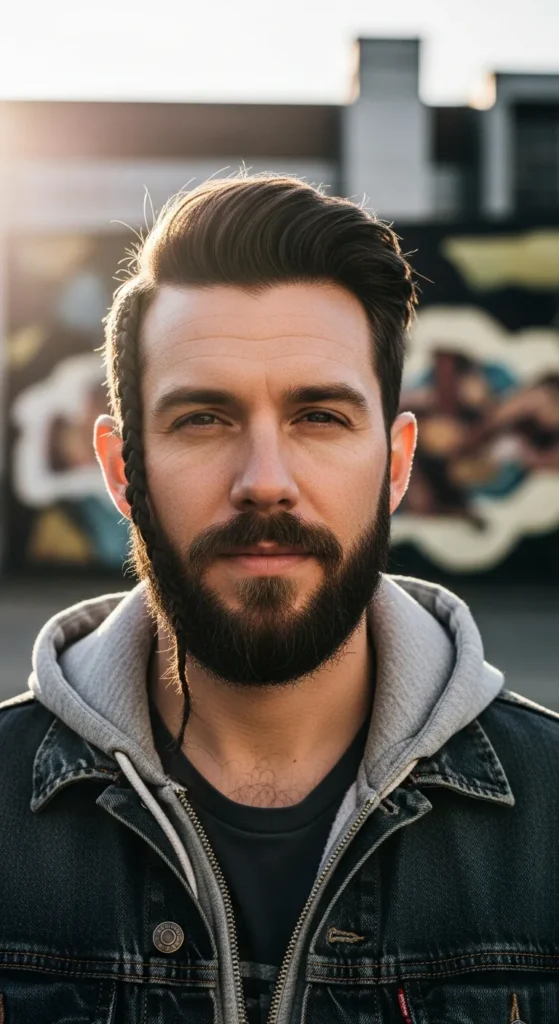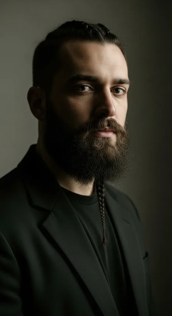 One thin braid hidden within a fuller beard adds quiet boldness. It’s subtle but intentional, perfect for low-key rebels.