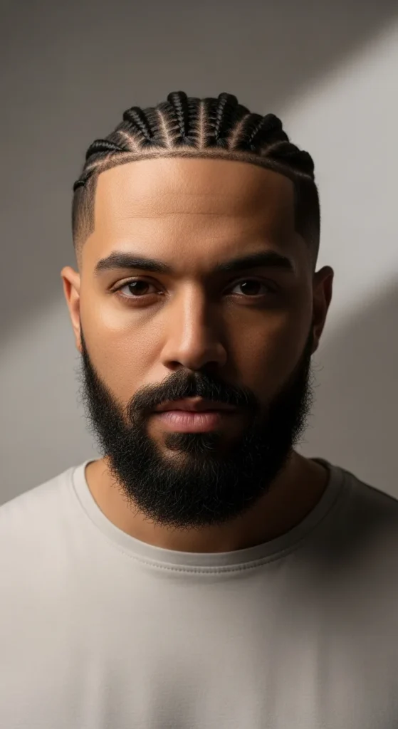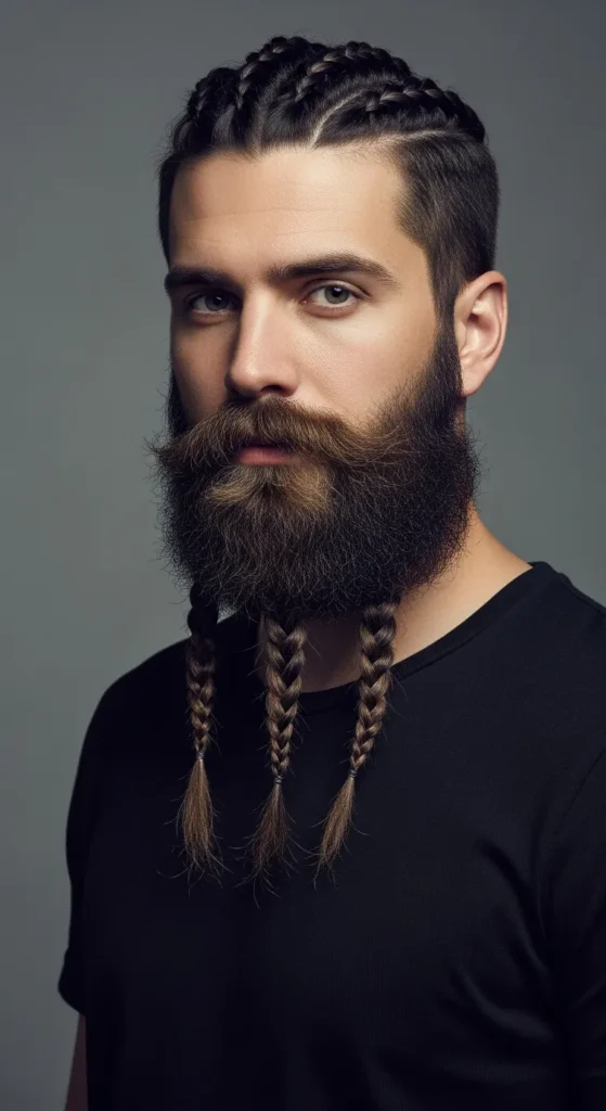 Two clean braids running downward give balance and symmetry, making this style feel intentional and powerful. It’s bold without being messy and works great if your beard grows evenly on both sides.