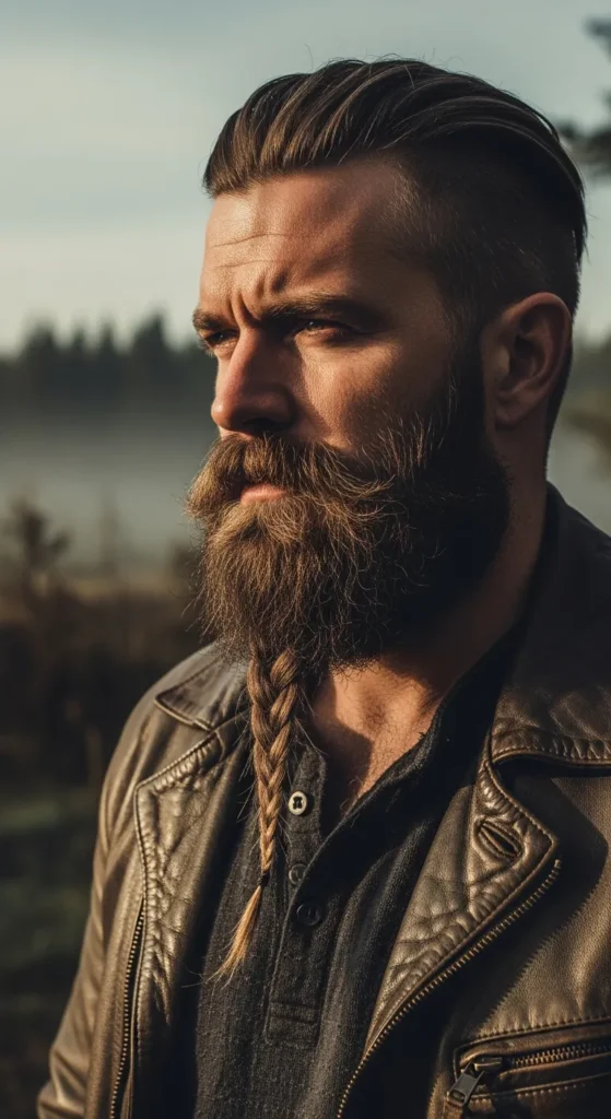 Gathering the beard into a low braided pony feels modern and fearless. It’s practical while still making a bold visual statement.