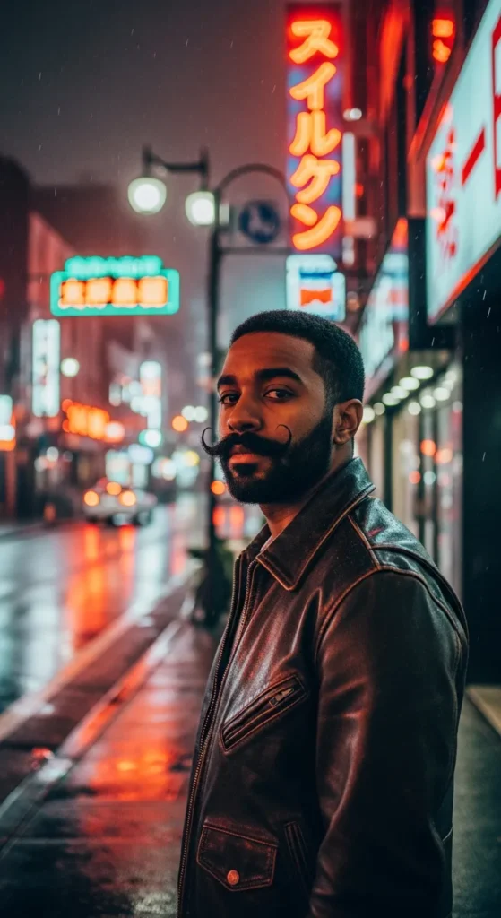 Heavy mustache paired with a shorter beard underneath. It gives a retro-meets-modern vibe that feels creative and confident.