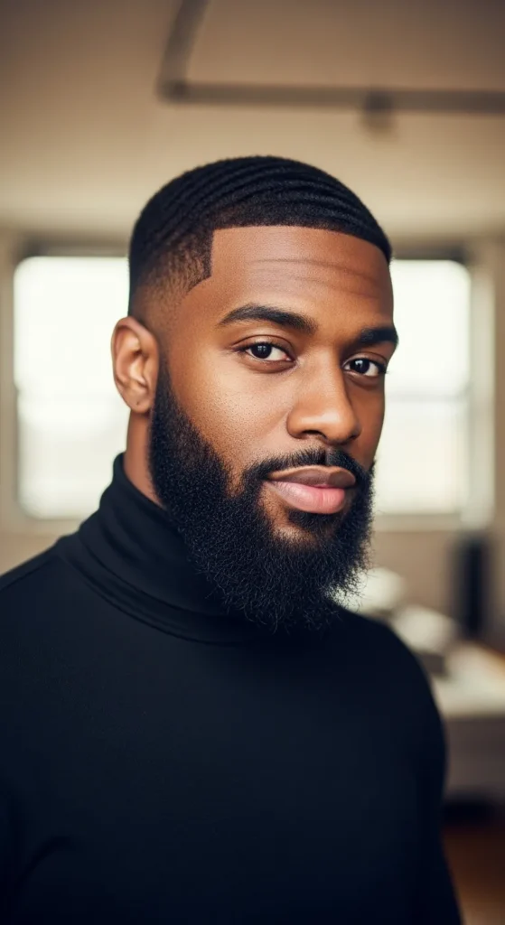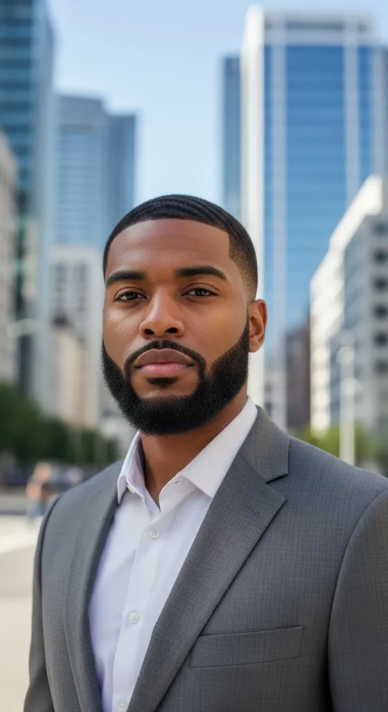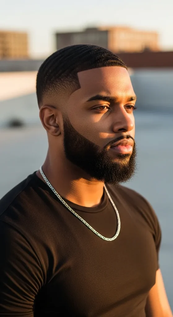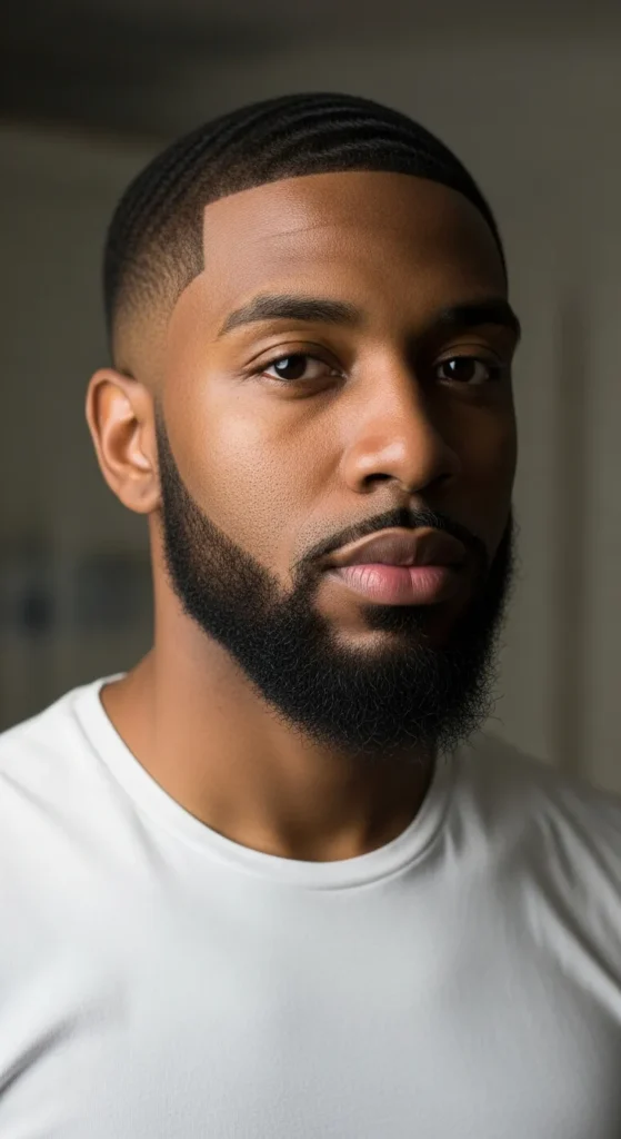 A low fade haircut transitioning into a dense, squared beard. It looks disciplined, powerful, and extremely clean.