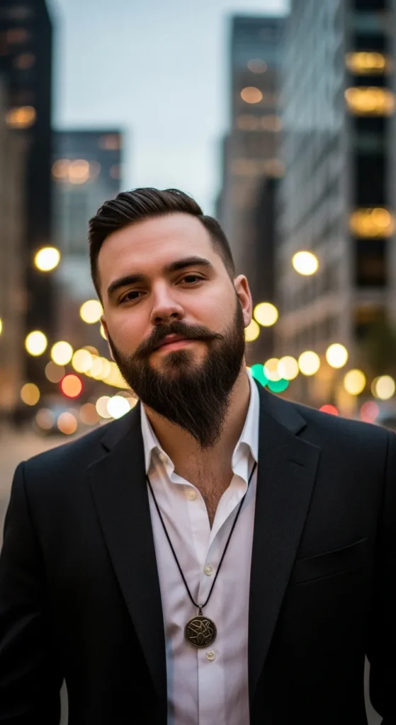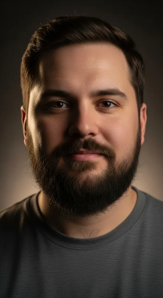 This beard builds volume at the chin while keeping the sides tight, creating a strong vertical pull that visually lengthens a round face. Clean fades keep it sharp, modern, and confidently masculine.