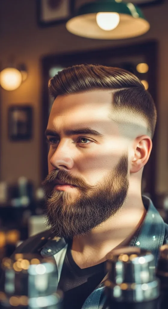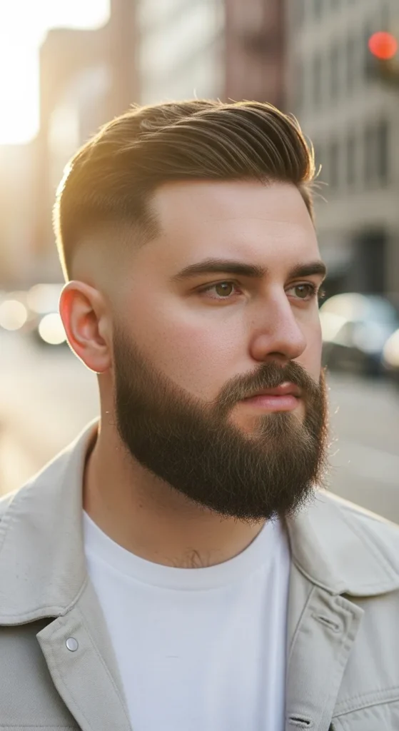 Barber Suggestion: Ask your barber to keep the chin dense and the cheeks tight. Use a lightweight beard cream daily so the fade stays crisp without puffing out the sides.