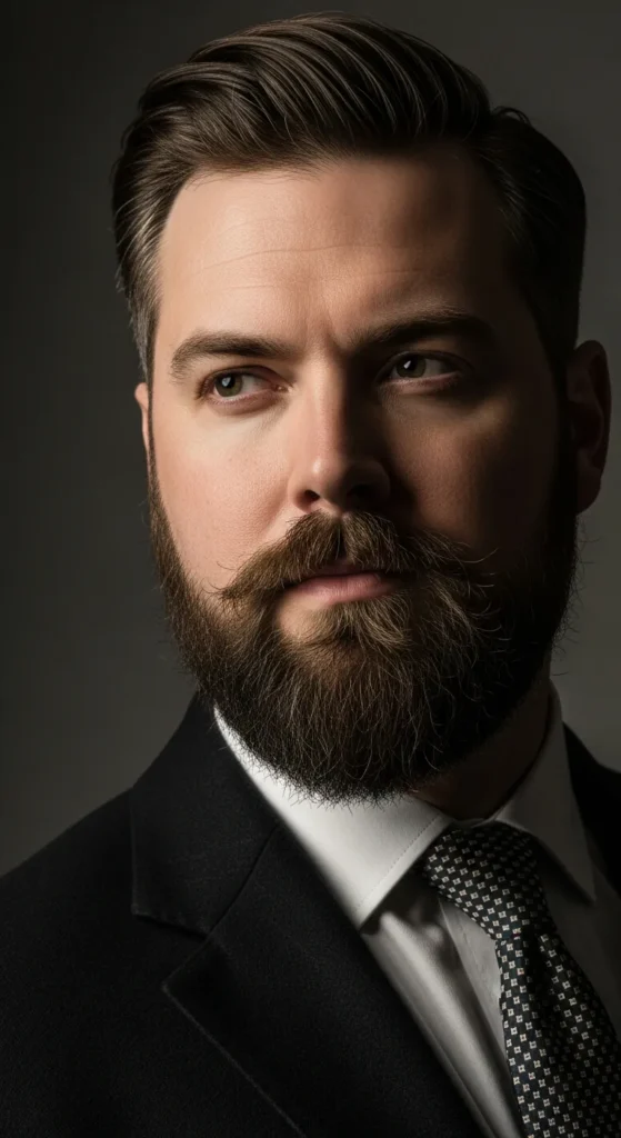 Barber Suggestion: Keep the mustache slightly shorter than the chin section. That contrast keeps the vertical flow strong and prevents the beard from looking heavy on top.