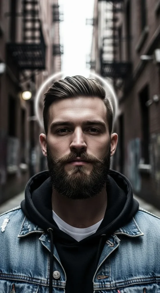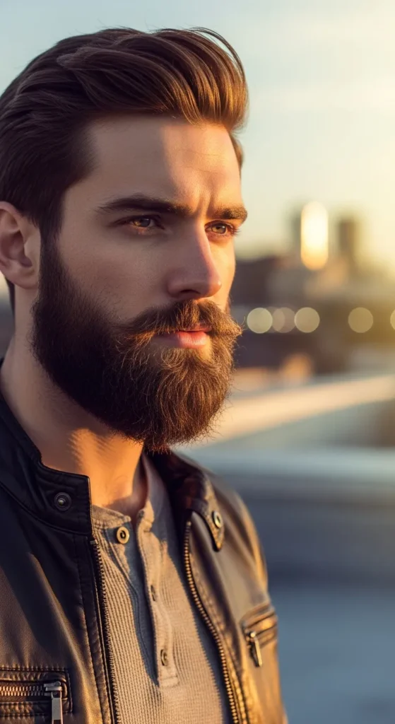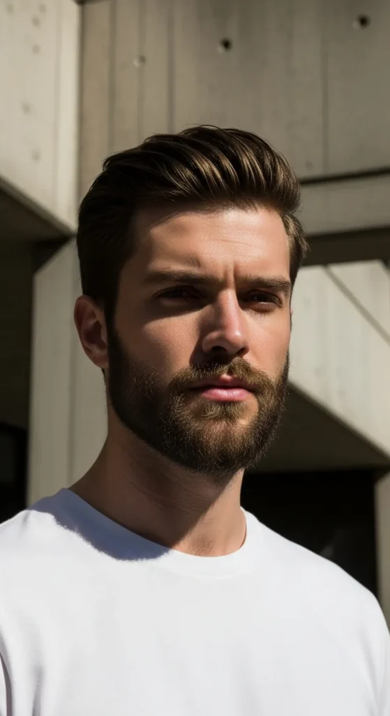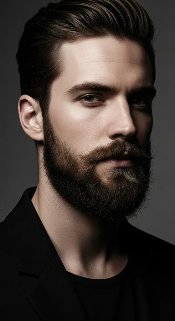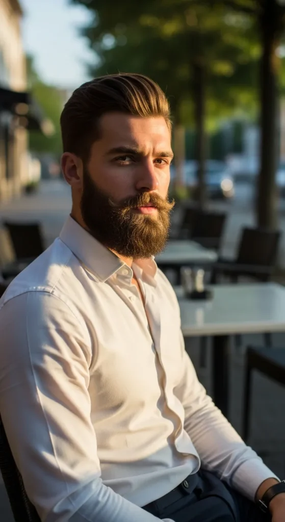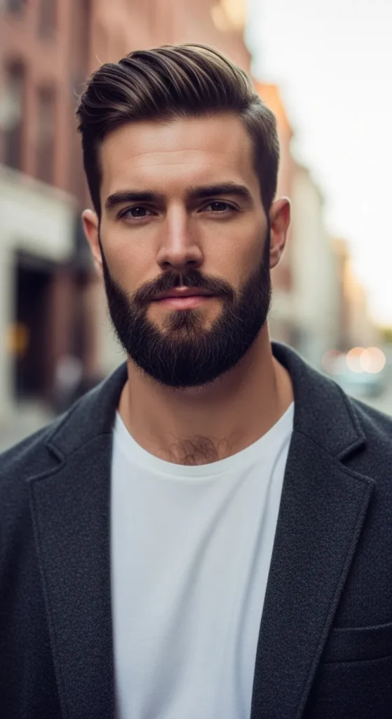 A faded transition from sideburns into a dense beard creates movement while keeping angles intact. It balances sharpness with flow, making square faces look athletic rather than boxy or heavy.