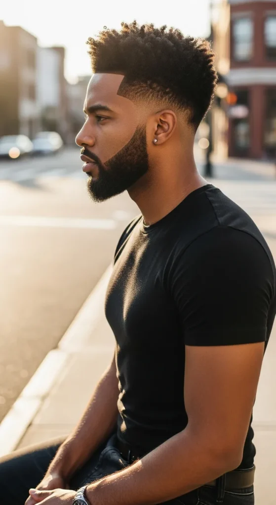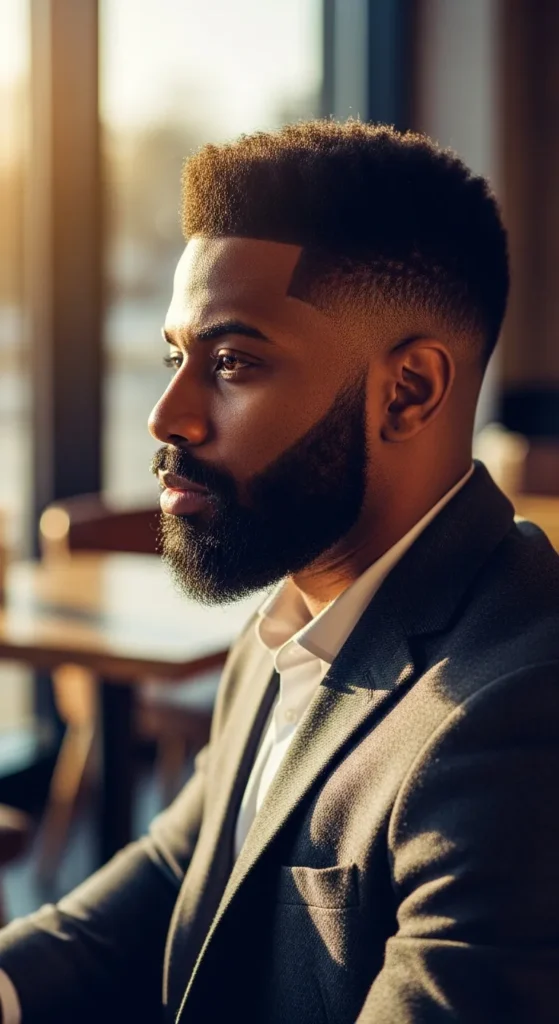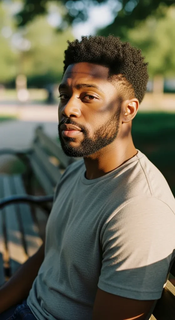 A compact afro with a neat low taper keeps things clean while preserving natural fullness. It’s bold in texture, subtle in shape.