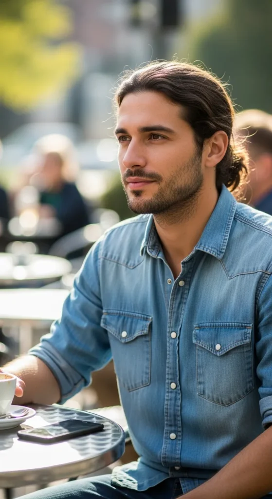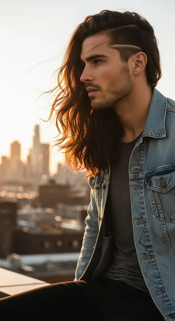 Hair falling just past the shoulders with subtle uneven ends, giving a true free-roaming, nomadic aesthetic. It’s rugged yet artistic, perfect for those who want length without looking overly styled.