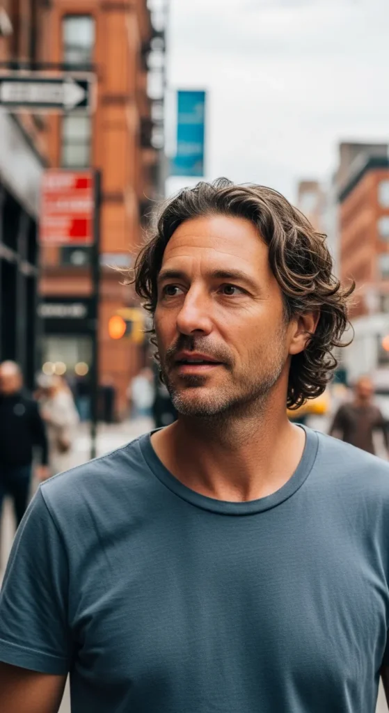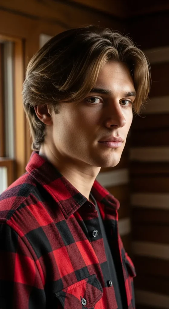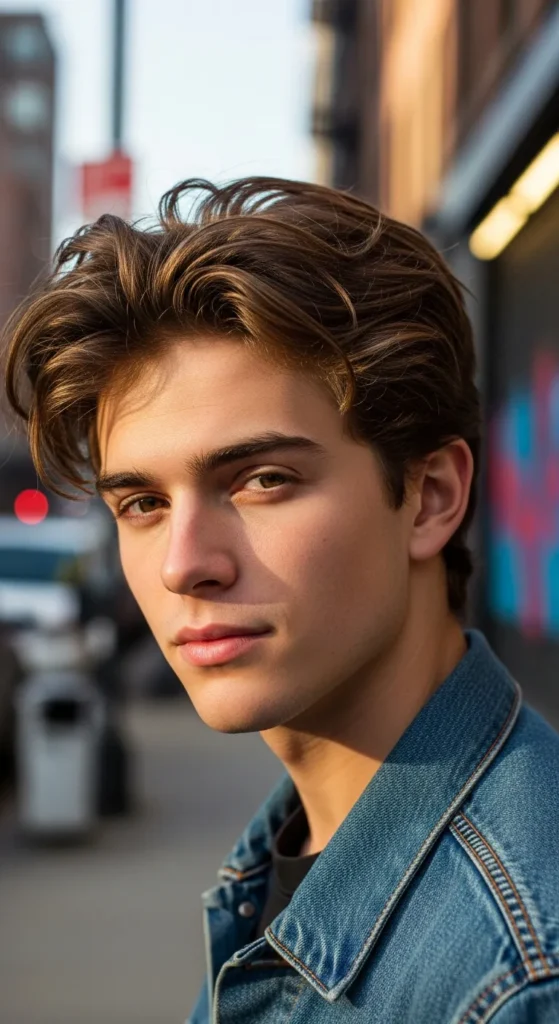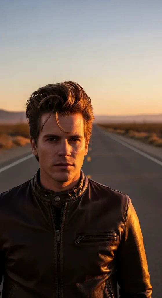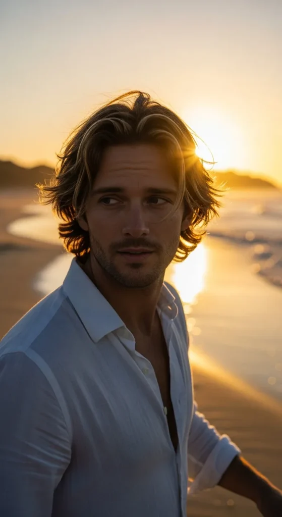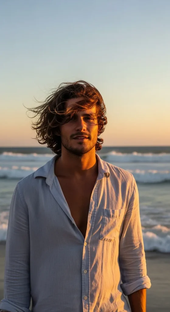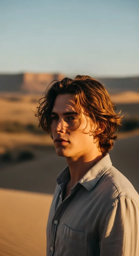 Medium-length hair brushed back loosely with volume, but not polished. It feels slightly rugged, like it’s been shaped by wind instead of a comb.