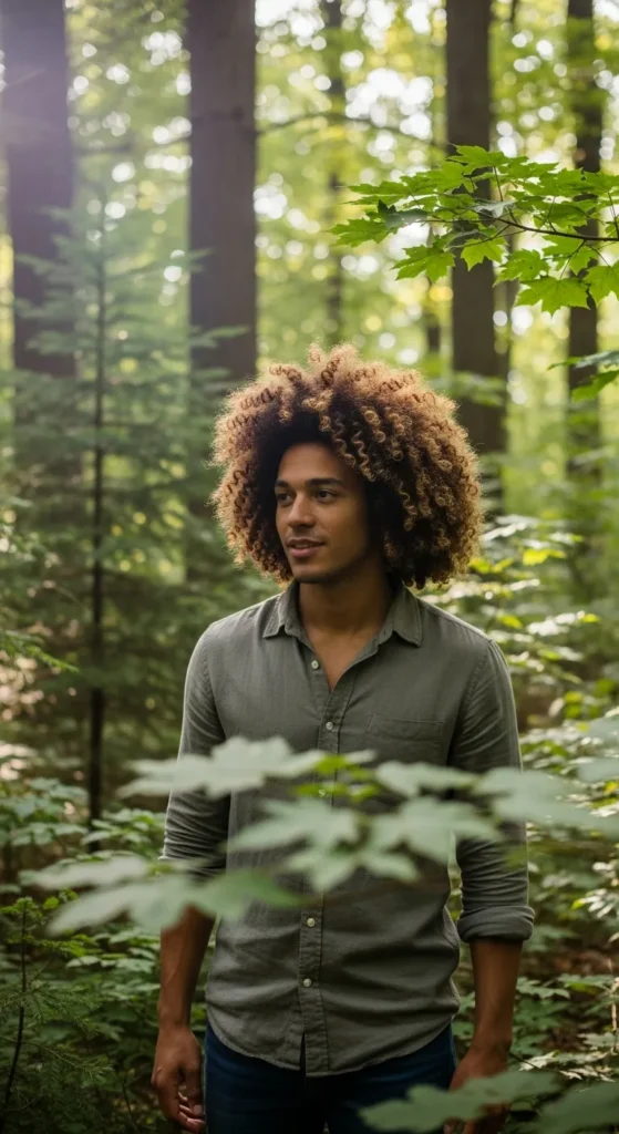 Natural curls left to grow and shape themselves, forming a bold yet carefree silhouette. This look celebrates volume and texture without forcing structure onto it.