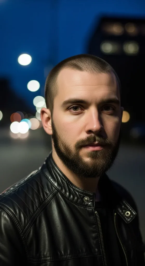 Think controlled ruggedness. A dense 5–7 day stubble under a tight buzz cut. It enhances masculine edges while keeping everything low-maintenance and touchable.