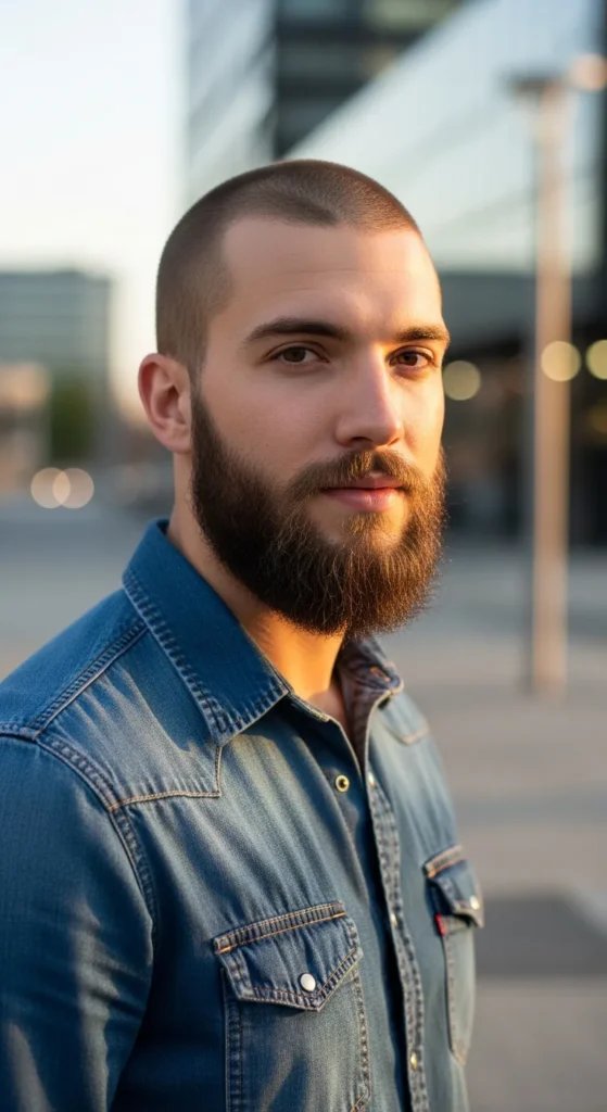 A slightly thicker short beard paired with a classic even buzz cut. It’s relaxed yet strong, giving street-style confidence without looking messy.