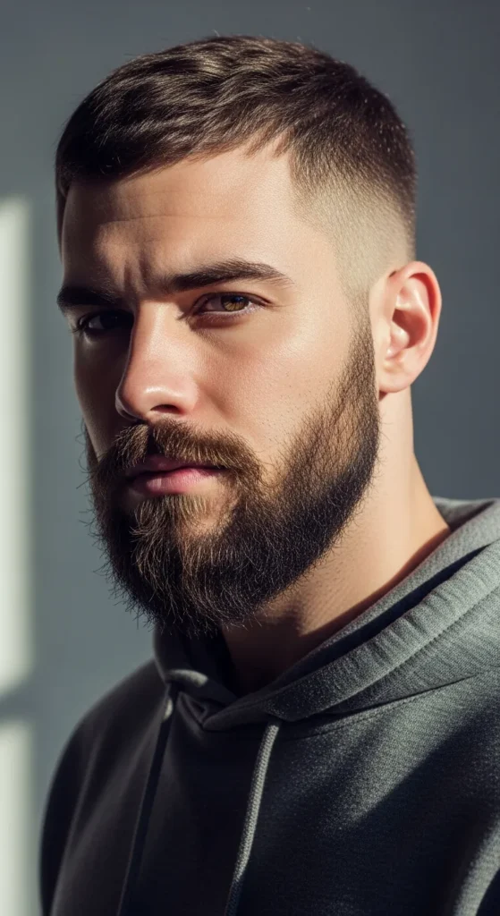 Inspired by Michael B. Jordan’s sharp grooming, this clean fade paired with a short top is bold and controlled. It highlights facial structure and looks incredibly fresh with a well-shaped beard.