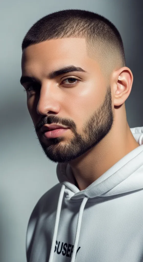 Clean, sharp, and bold, this buzz cut with precise hairline definition channels Drake’s minimalist power look. It highlights jawline and facial features with zero distractions.