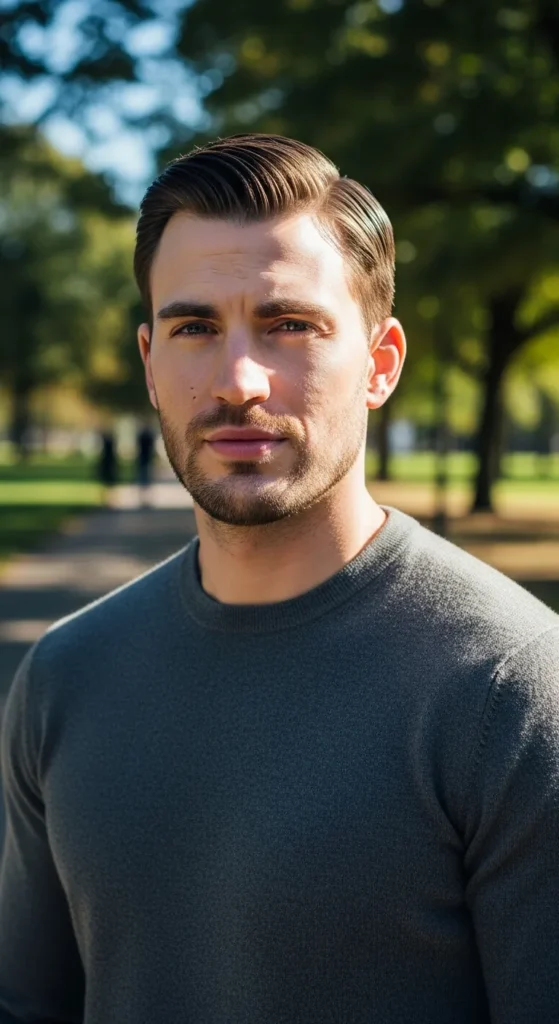 Timeless and clean, this short classic cut inspired by Chris Evans is versatile and dependable. Neatly tapered sides with moderate top length make it universally flattering.
