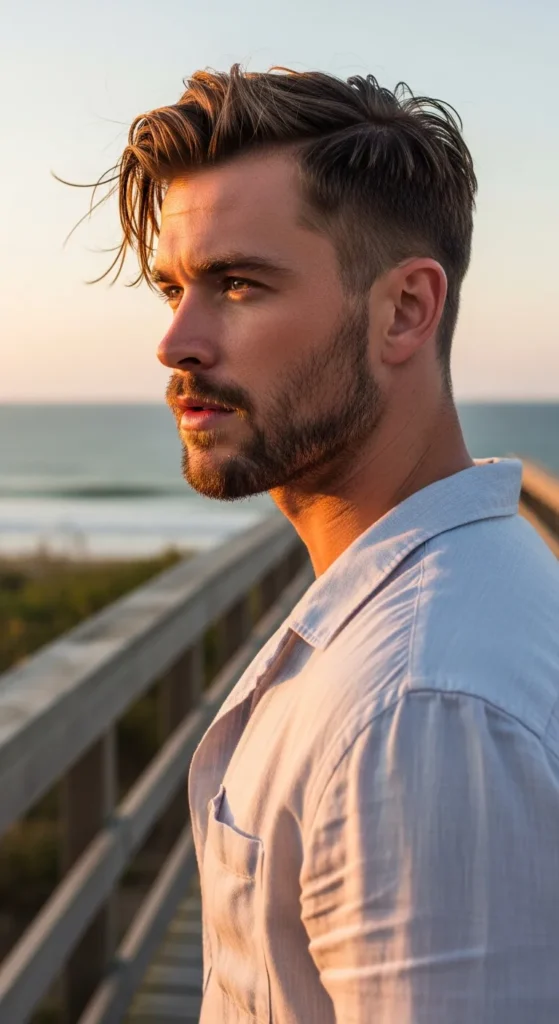 This short swept-back style carries laid-back confidence. The top has movement without being long, and the sides stay neat. It’s masculine, beach-ready, and works especially well with thicker hair.