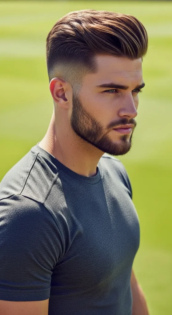 Ultra-clean tight fade with short top length creates athletic sharpness. Inspired by Kylian Mbappé’s precise grooming, it’s energetic and low-maintenance.