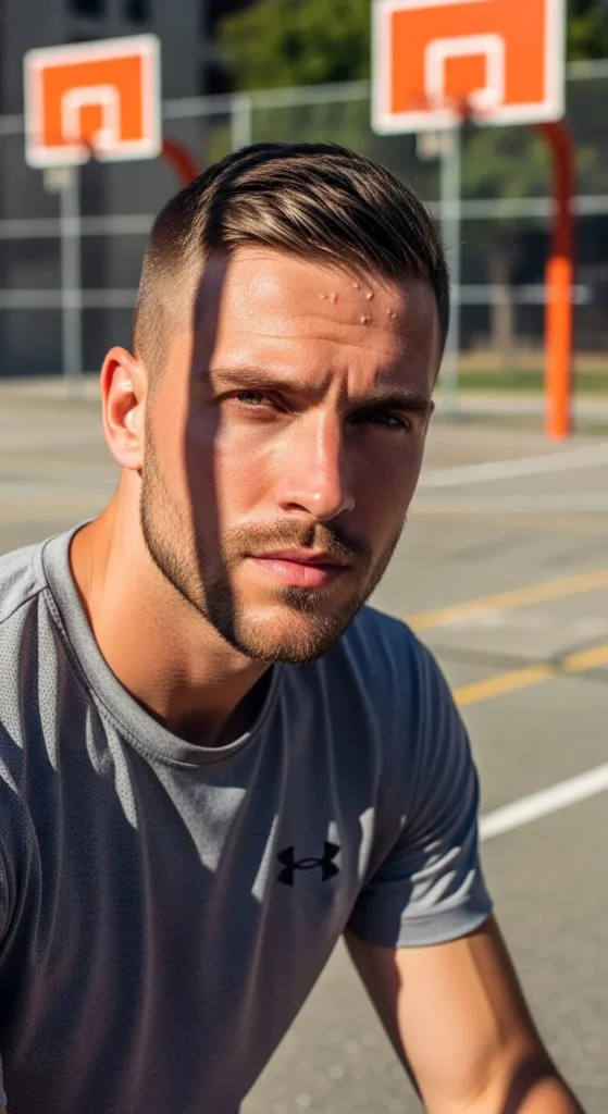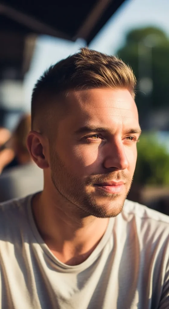 A slightly grown-out buzz cut with subtle texture on top. Minimal effort, maximum confidence, and perfect for intense heat.