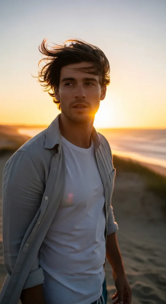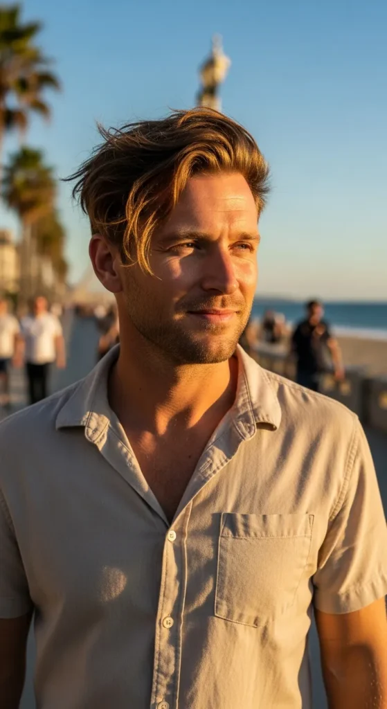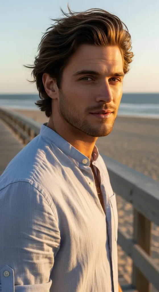 A relaxed yet structured style where medium-length hair flows naturally backward with layered texture. It feels effortless but intentional, giving you that “just stepped out of the ocean” confidence all summer long.