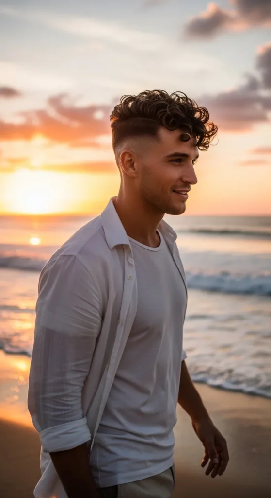 Natural curls kept on top with clean, tapered sides. It celebrates texture while keeping the overall shape controlled and summer-friendly.