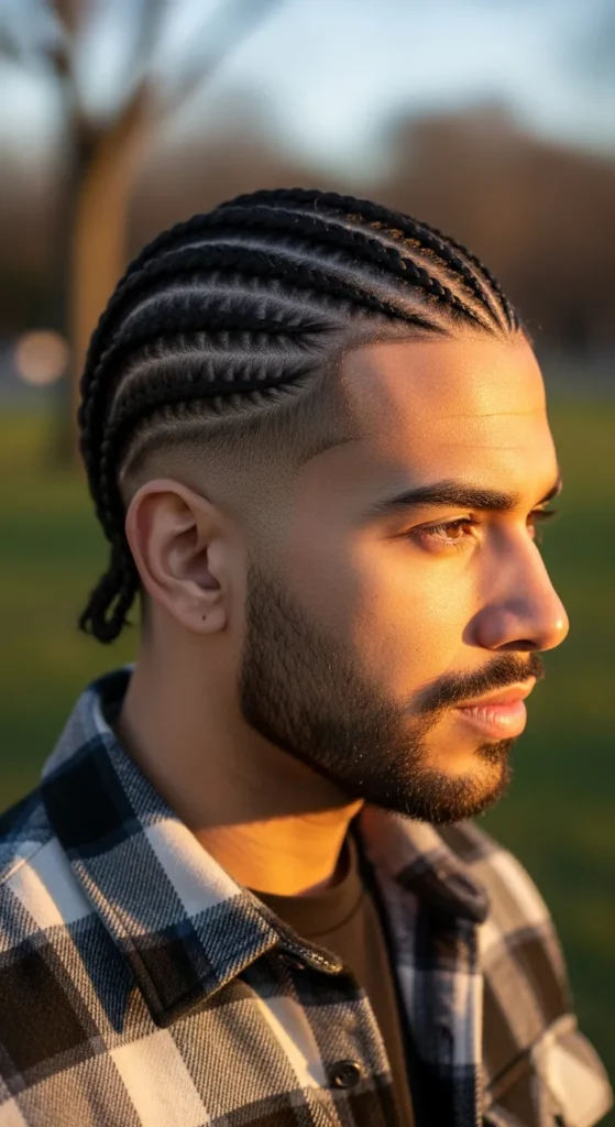 Cornrows styled on a slightly raised top with faded sides create height and structure. It elongates your face and adds bold presence without needing extra designs.
