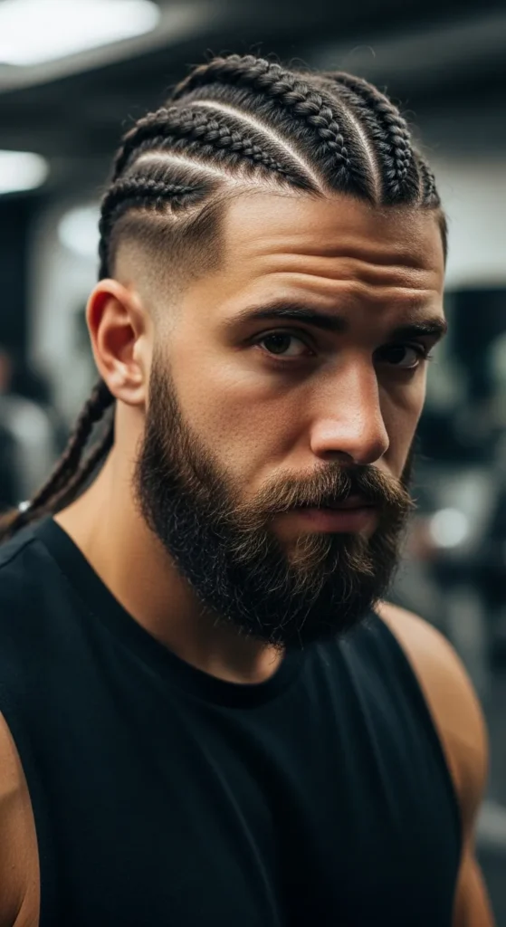 A defined center part splitting symmetrical cornrows creates balance and bold structure. It frames your face evenly and feels powerful, especially with a clean beard shape.