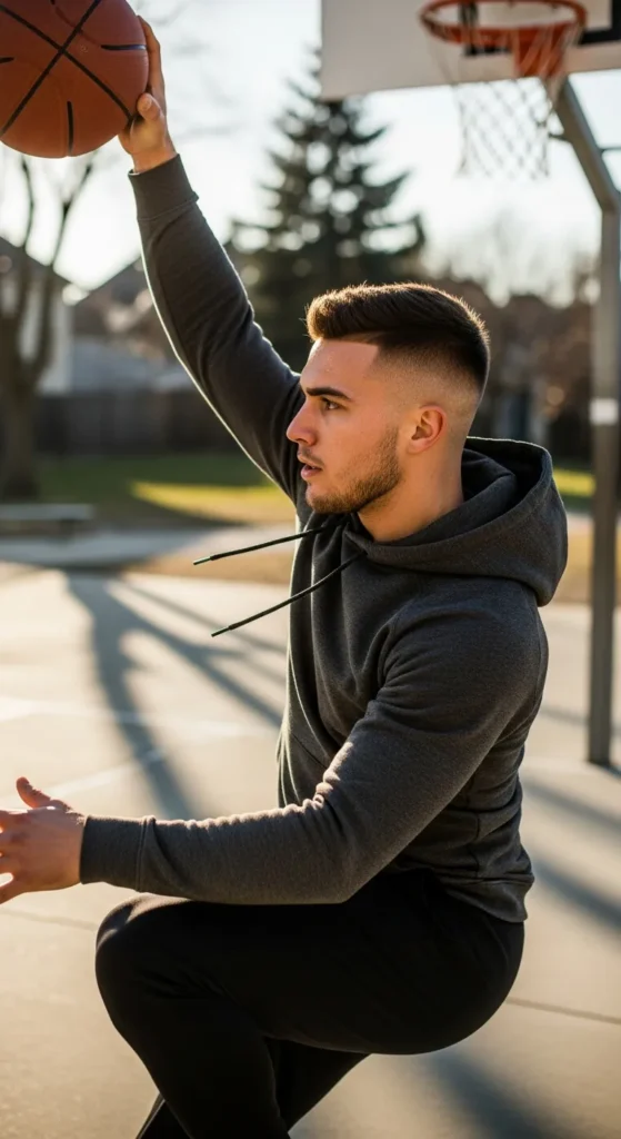 Built for active days, this crew cut pairs a tight athletic fade with a compact top that stays neat through sweat and movement. It’s clean, confident, and performance-ready.