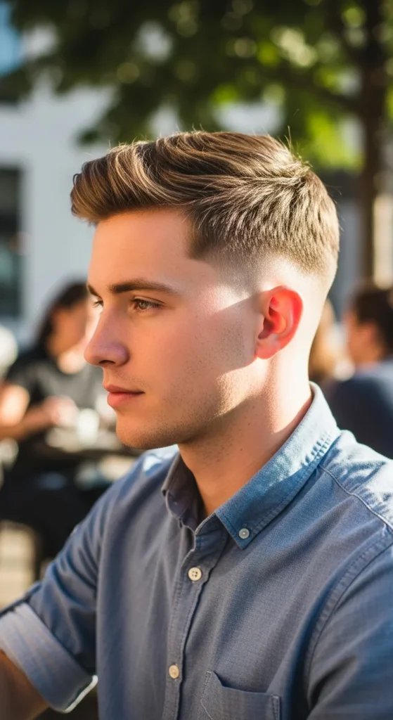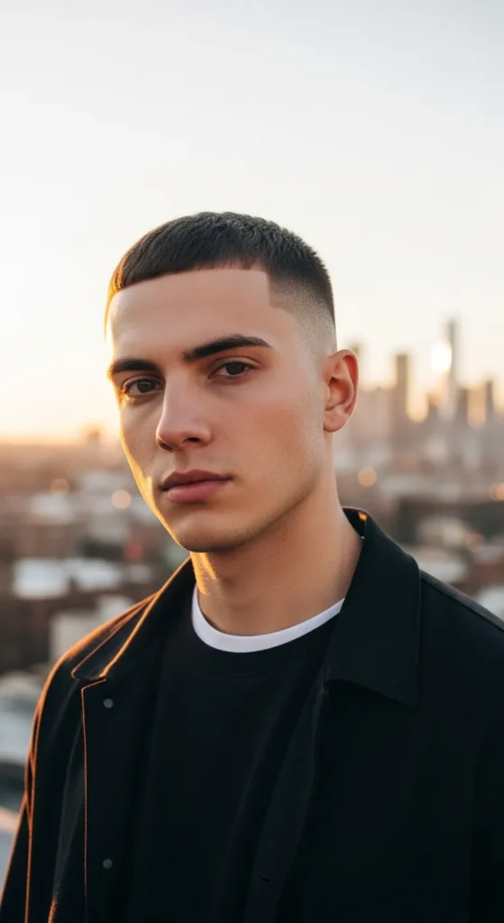 A tight crew cut blended into a soft shadow fade creates a smooth, clean finish without looking too harsh. It’s sharp but subtle, perfect for everyday wear while still turning heads when the light hits that seamless fade.
