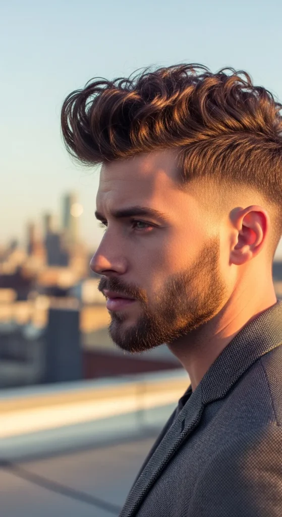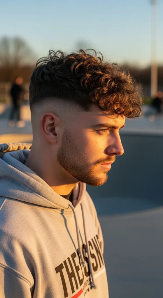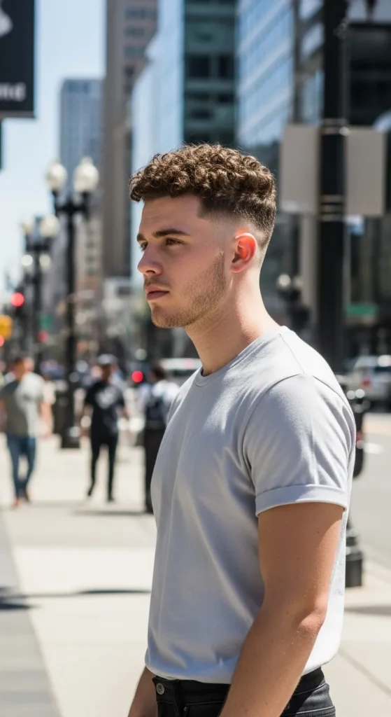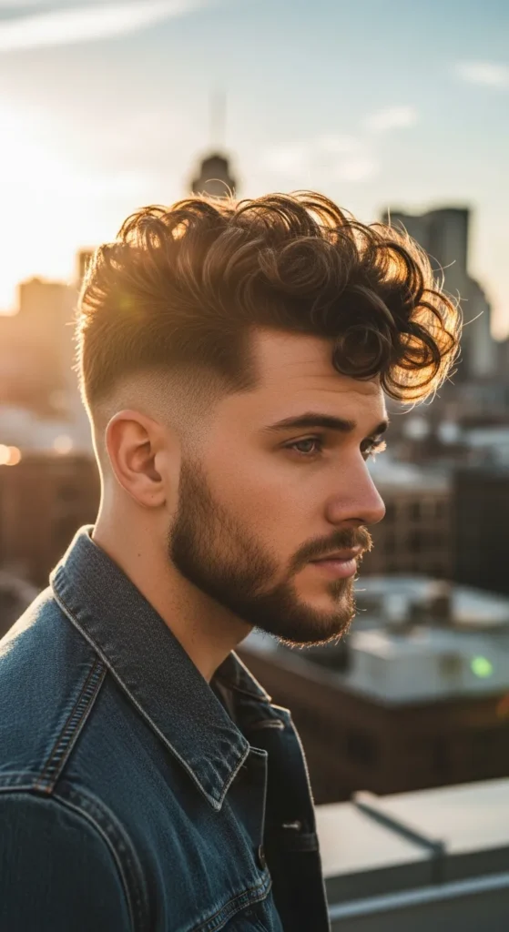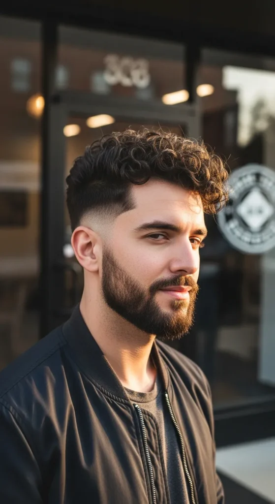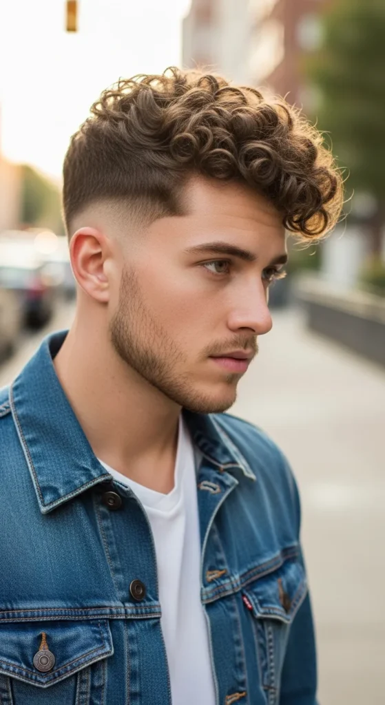 This haircut blends a smooth fade with thick defined curls on top, giving curly hair a controlled lift without letting it explode outward. The fade keeps the sides clean while the curls remain the star of the style.