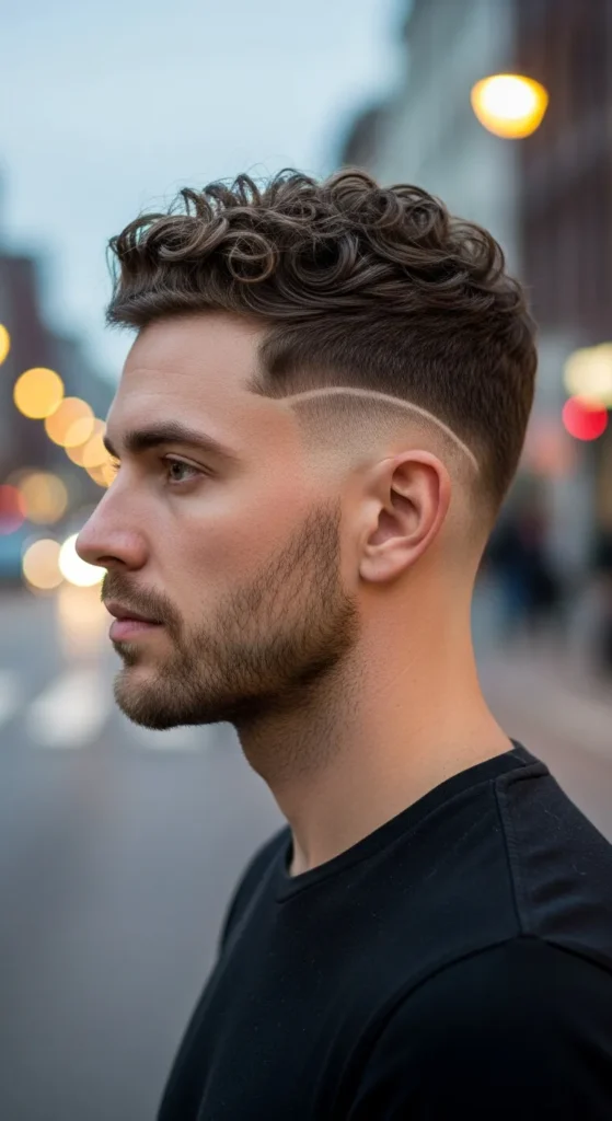 This haircut focuses the fade around the temples, keeping the rest of the curls natural and full. The result is a style that frames the face while keeping curly volume under control.