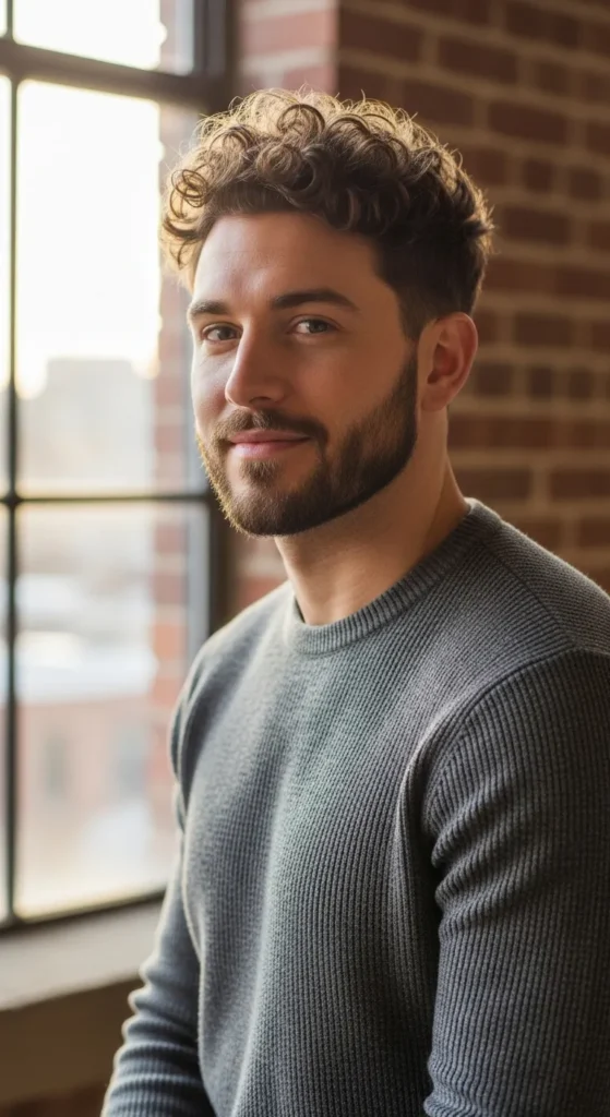 The curls fall slightly forward in a controlled fringe, creating movement without overwhelming the face. The sides remain neat, allowing the front curls to add personality while still feeling structured.