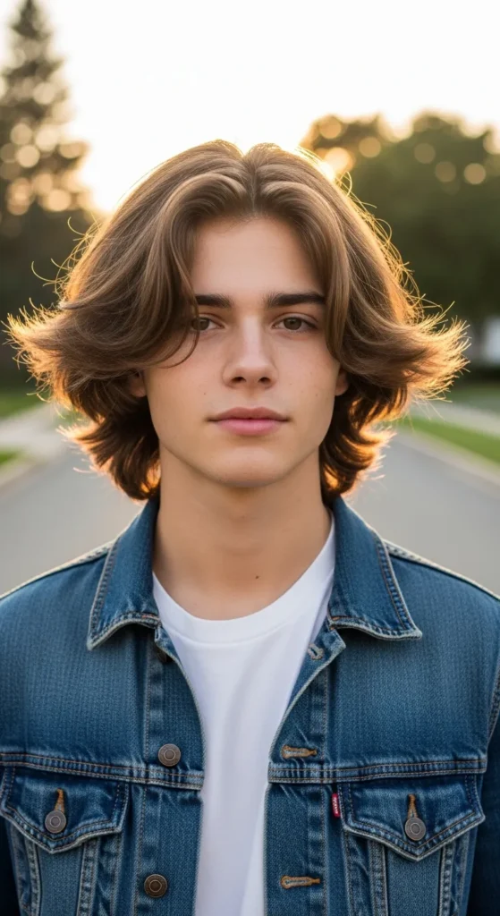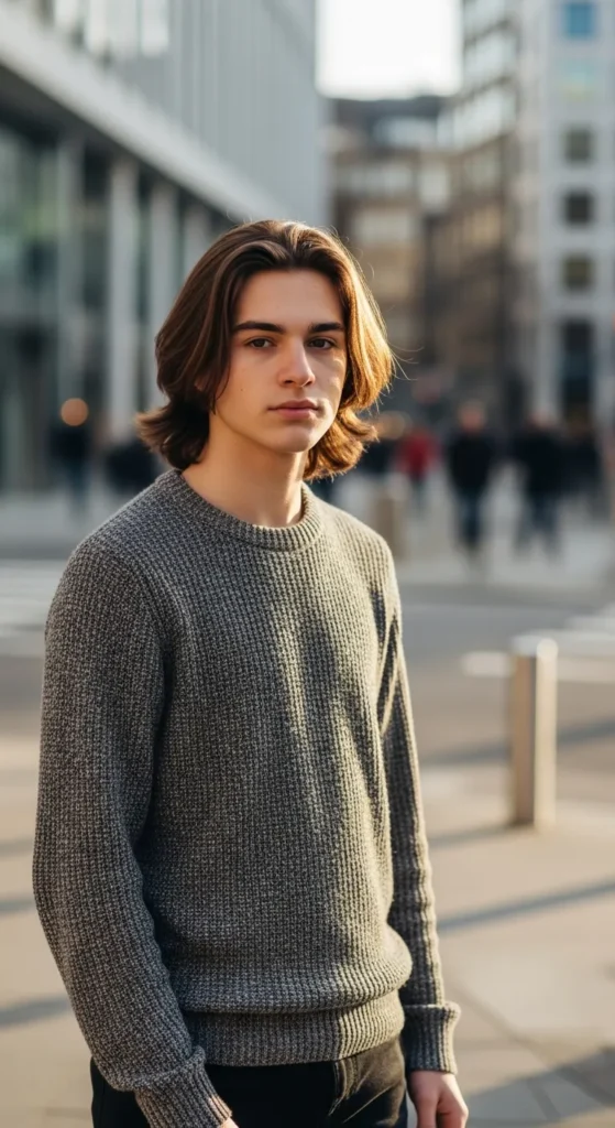 This style blends long curtain bangs with smooth flowing sides that tuck slightly behind the ears. The result is clean, balanced, and naturally stylish, perfect for guys who want something trendy but still polished.