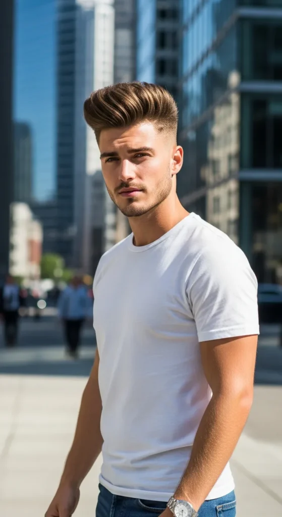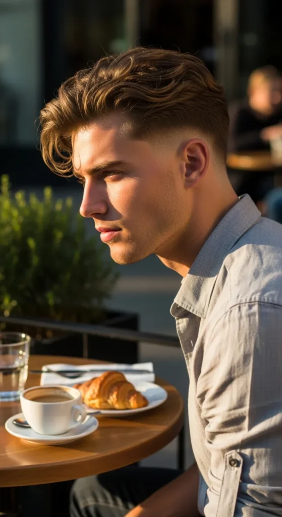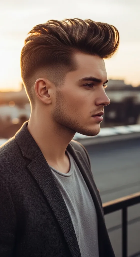 A softer pompadour paired with a drop fade gives you classic volume with a modern edge. The lifted front gradually blends into shorter sides, creating a stylish but wearable shape.