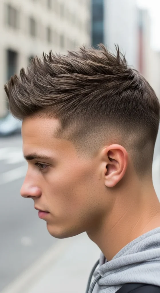 Short textured spikes with a drop fade create a sharp, youthful look. The spikes add energy while the fade keeps the sides crisp and structured.