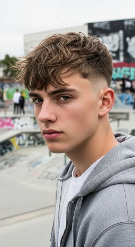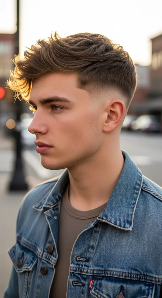 This look blends a sharp drop fade with a messy textured crop on top. The short layers create movement while the curved fade keeps everything looking clean and balanced, making it a confident everyday style that feels fresh and effortless.