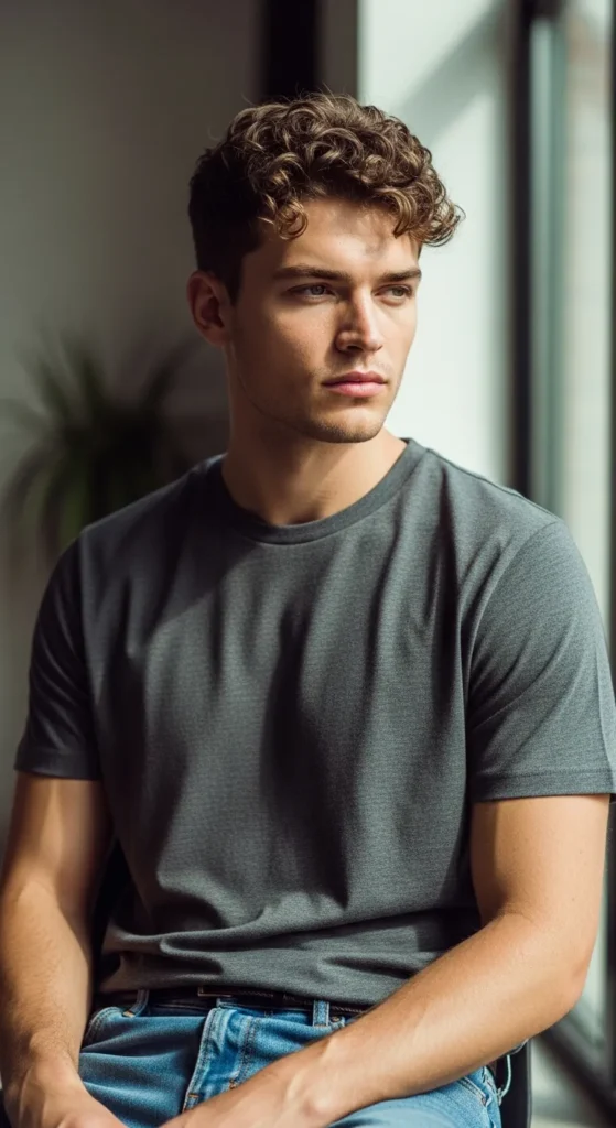 Curls falling slightly forward with faded sides create a youthful, modern vibe. It frames the face well without hiding it.