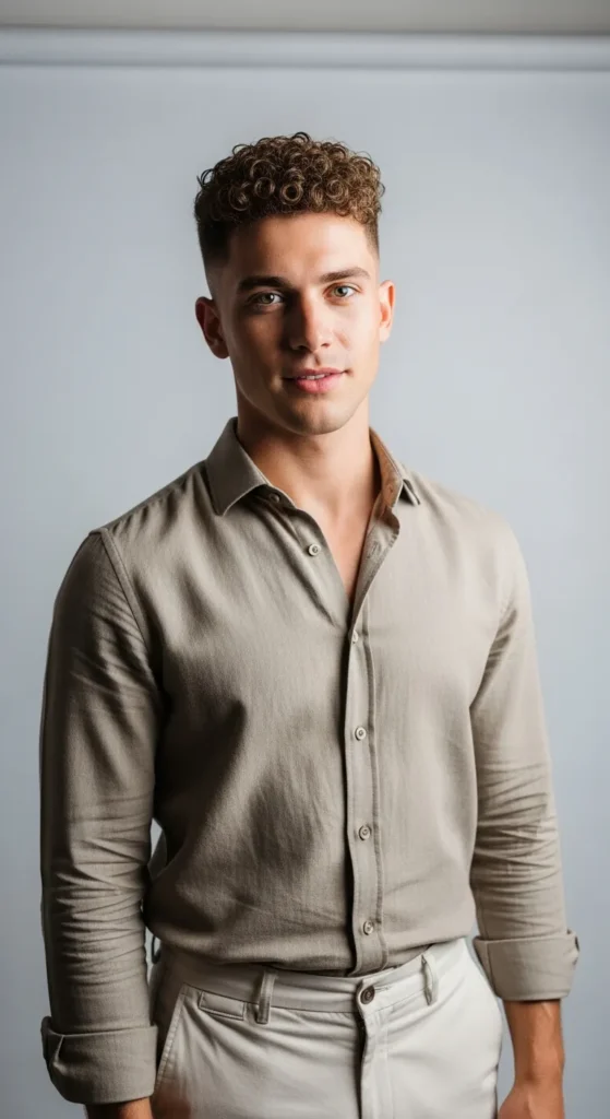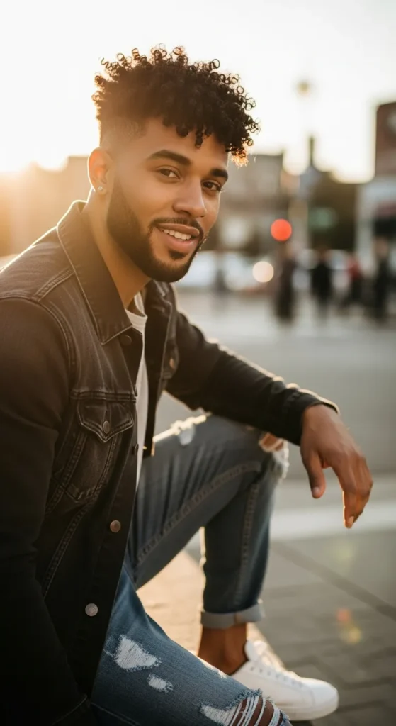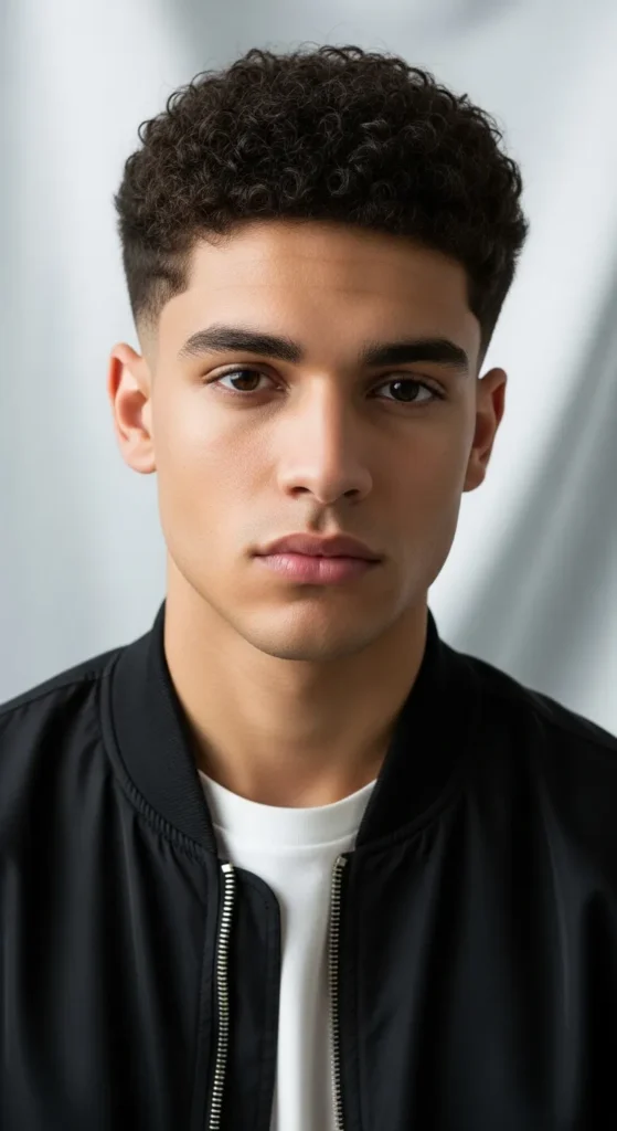 Short curls in front with a tight fade create a clean, youthful look that never feels messy. It’s ideal if you like your curls controlled but still textured.