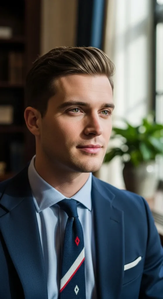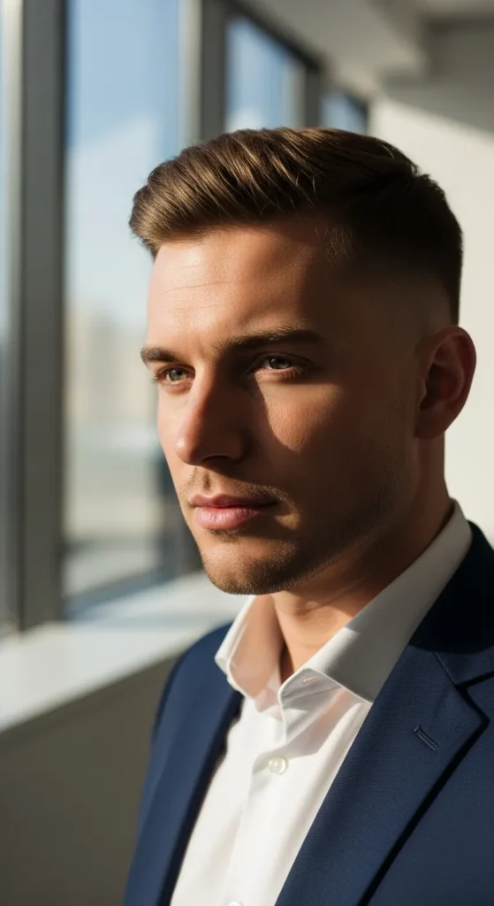 Inspired by classic Ivy League cuts, this fade version adds freshness while staying professional. It’s timeless, reliable, and works across industries.
