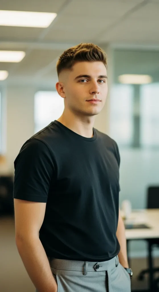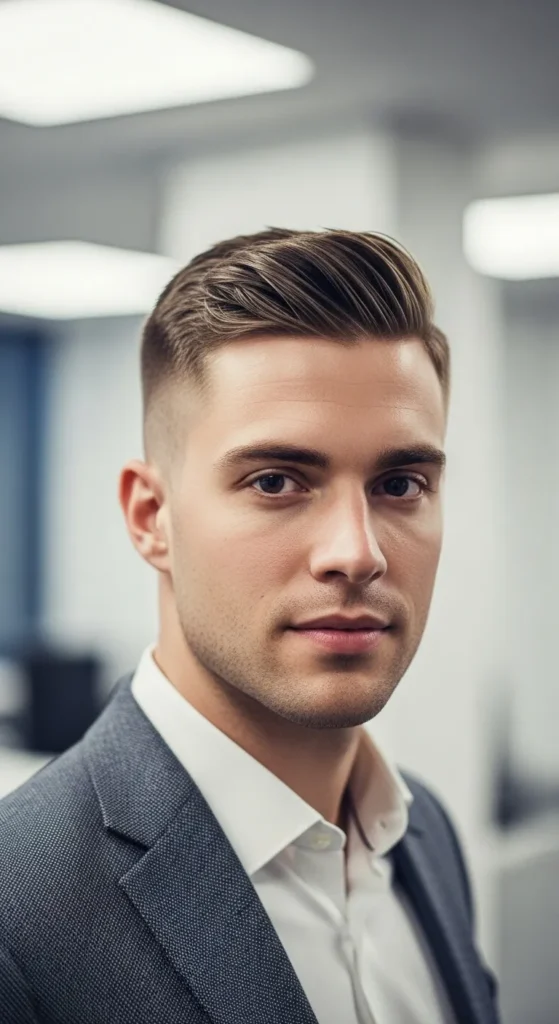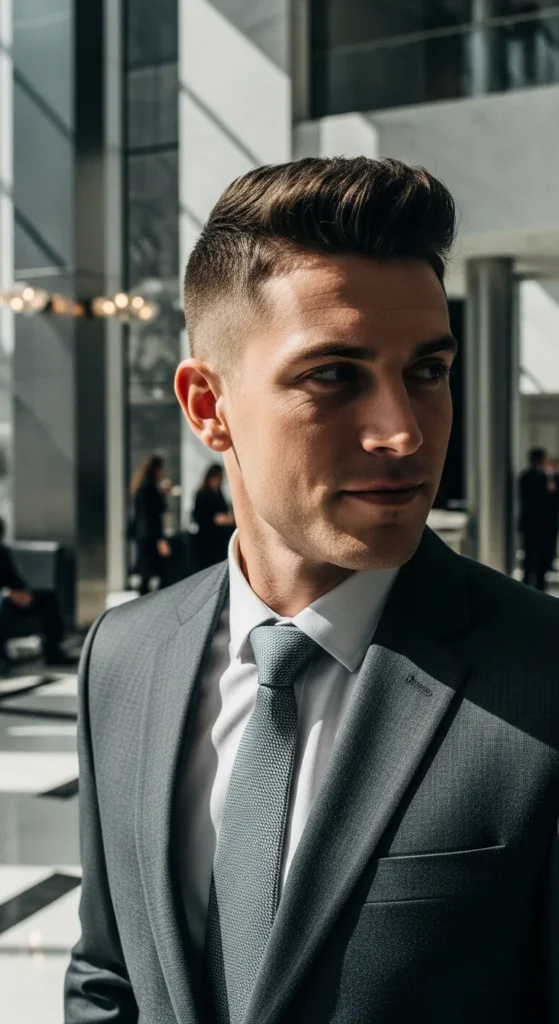This fade bridges the gap between formal and relaxed, making it ideal for flexible dress codes and creative offices.