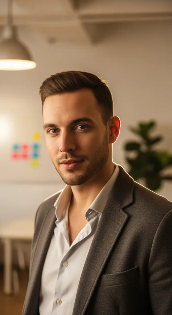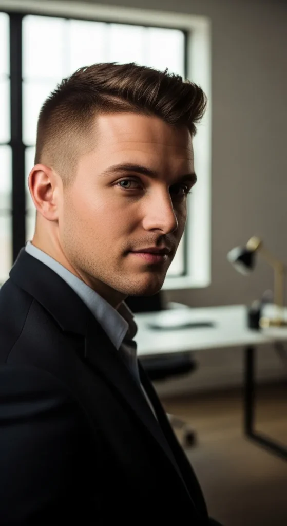 This style allows natural movement on top while keeping the sides tight. It’s perfect for professionals who want personality without losing control.