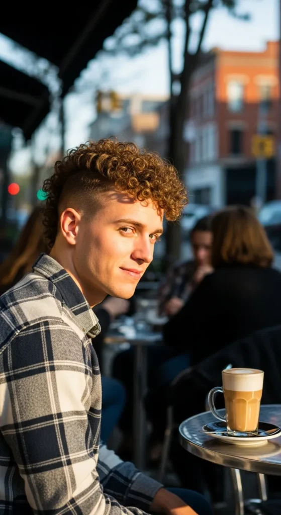 Perfect for naturally curly hair, this faux hawk lets curls form a defined ridge down the center. The sides stay faded to keep it sharp while the curls bring texture and personality.