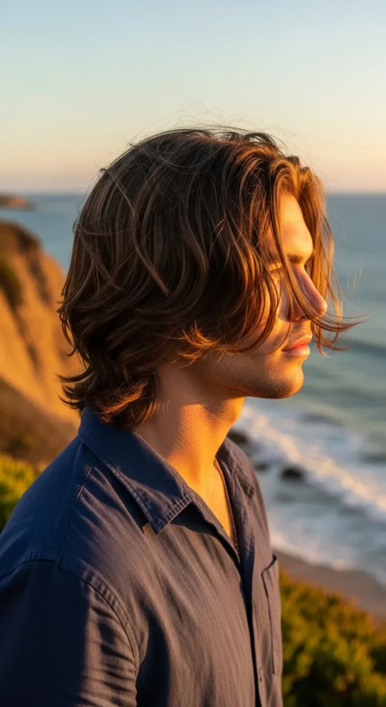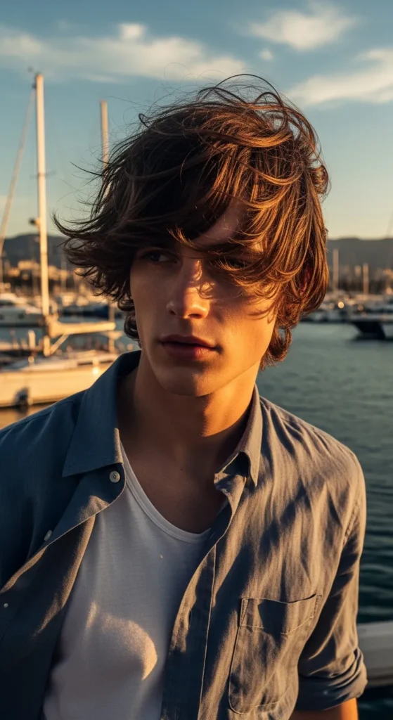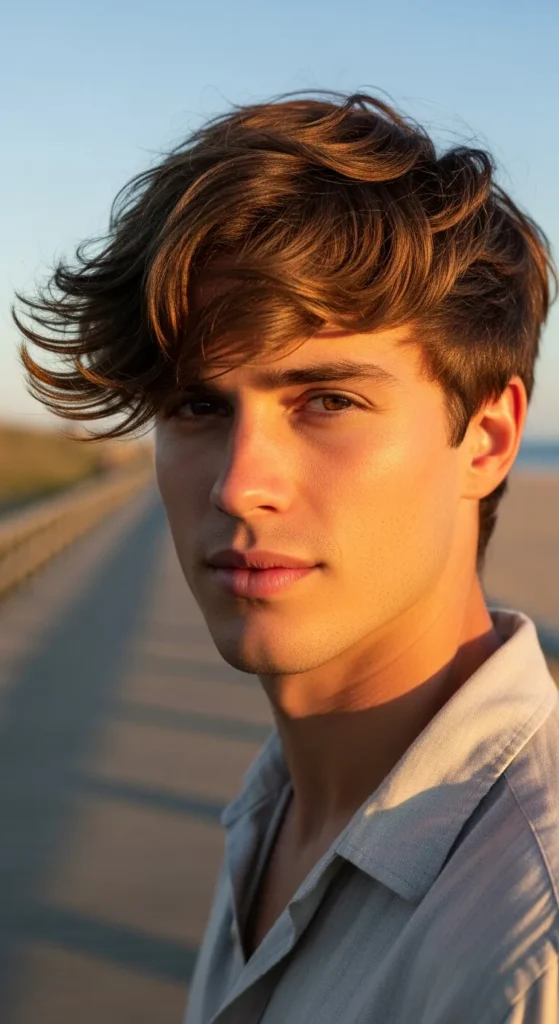 This relaxed haircut mimics the feeling of coastal wind pushing the hair slightly forward. The bangs sit naturally across the forehead while the rest of the hair flows backward in loose layers.