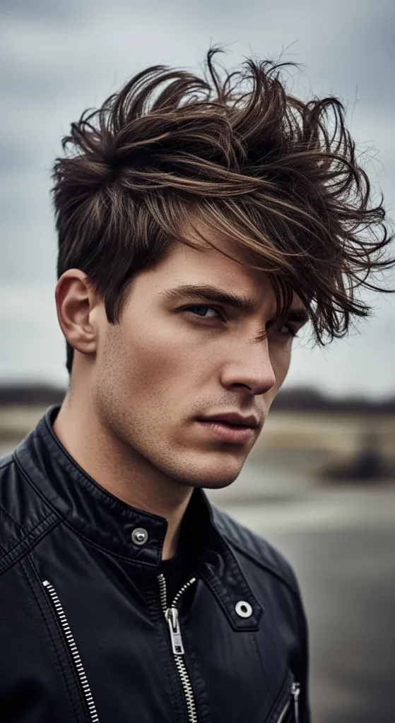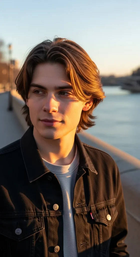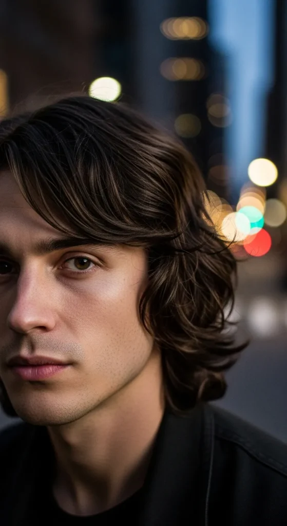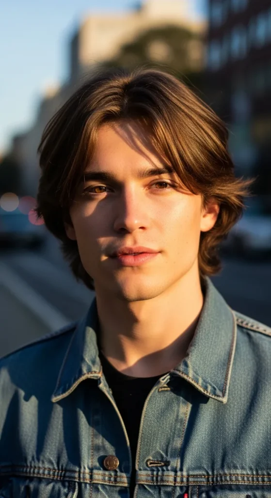 This style blends flowing layers with loose curtain bangs that fall naturally across the forehead. The haircut looks slightly rebellious but still stylish, giving a laid-back energy that works perfectly for everyday wear.
