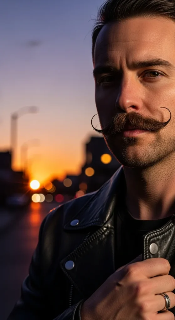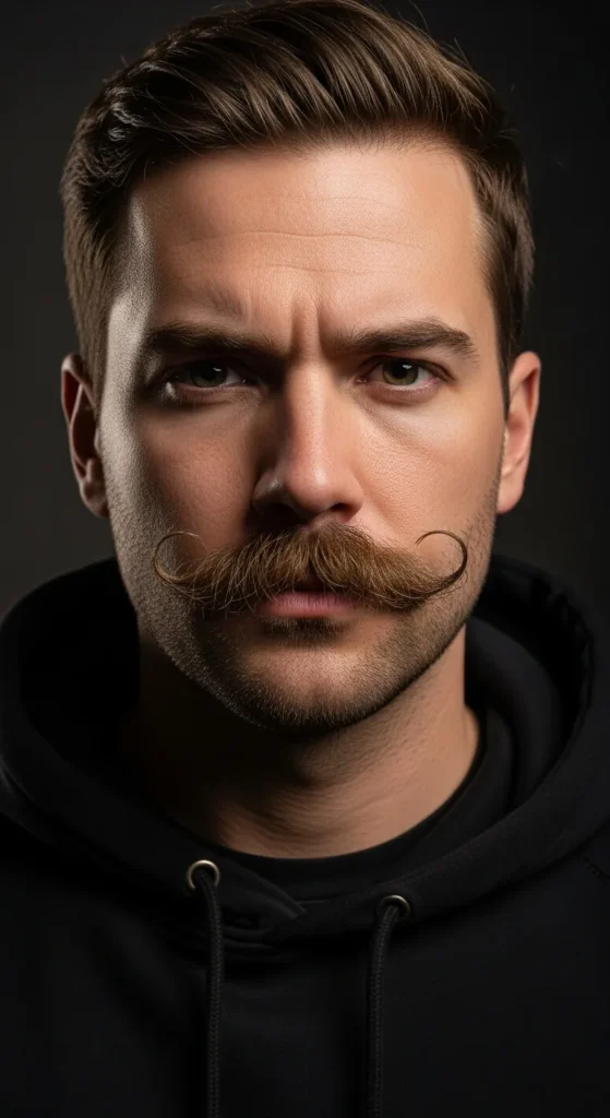 This full-bodied handlebar features thick growth with dramatic upward curls that frame the face with authority. It feels powerful, almost regal, perfect for those who enjoy a commanding yet polished presence.