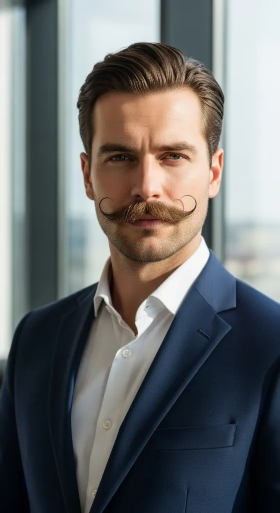 Barber Suggestion: Keep the mustache trimmed evenly and avoid over-waxing. Too much product can make it look stiff instead of naturally refined.