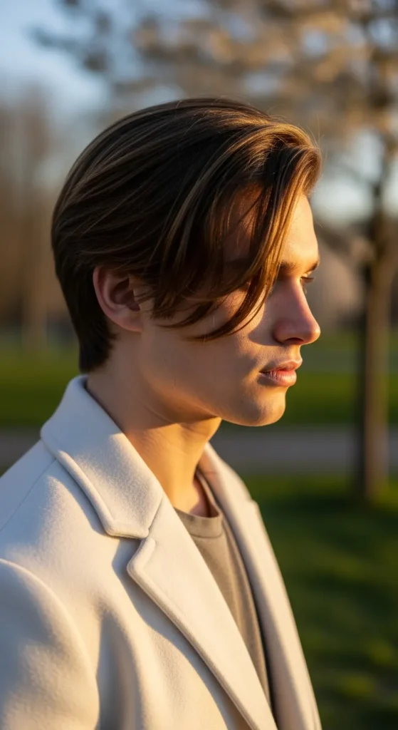 This modern twist on the classic comma style curves gently over the forehead, creating movement without covering the face. It feels romantic but masculine, polished yet relaxed for daily wear.
