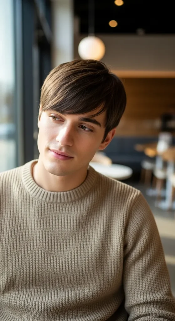 This sleek fringe falls lightly across the forehead with a polished shine. It frames the face softly while keeping the silhouette slim and modern, ideal for guys who like subtle style over bold fades.