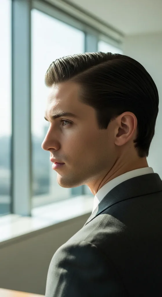 This refined side part keeps everything tight and controlled. The part is subtle, not dramatic, and the finish is smooth with a slight sheen that feels executive without being stiff.