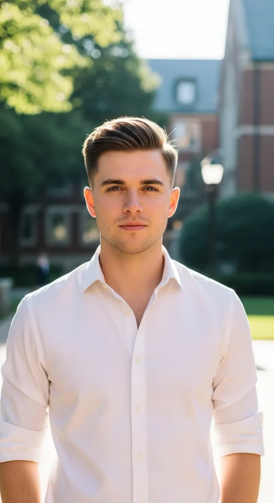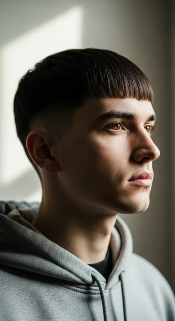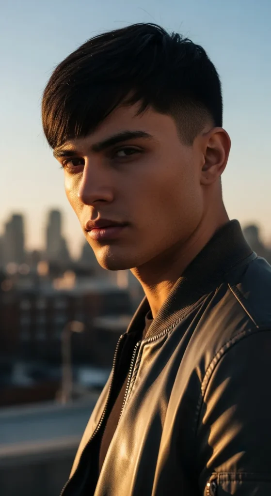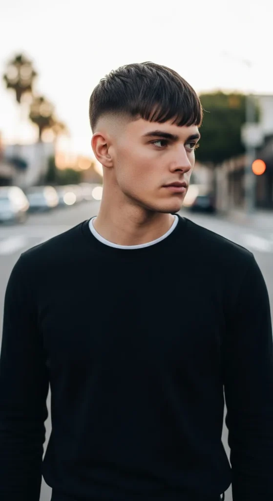 This style pairs a low shadow fade with a soft fringe that barely touches the forehead. It’s modern, subtle, and sharp from every angle.